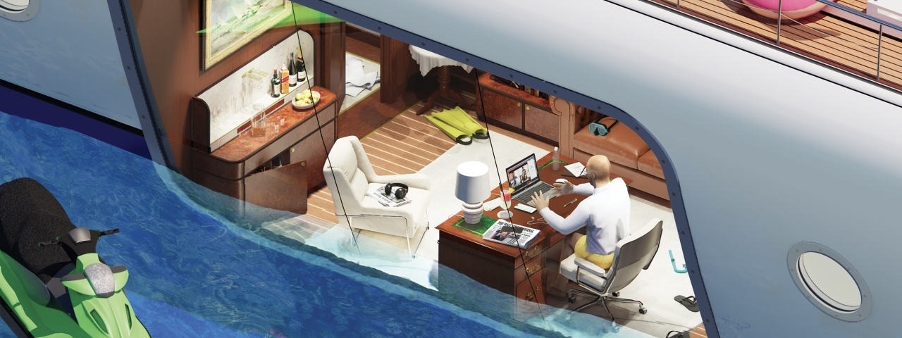 Sau đại dịch, khi làm việc từ xa trở thành bình thường mới, các doanh nhân siêu giàu nhanh chóng mở rộng khái niệm này ra đại dương. Dimitris Angelakos, người thừa kế gia tộc vận tải biển Hy Lạp và hiện điều hành đội du thuyền cho thuê riêng, cho biết ông thường bắt đầu buổi sáng bằng vài giờ email trong cabin có cửa sổ hướng thẳng ra biển, rồi kết thúc bằng cú nhảy xuống bể Jacuzzi hoặc đại dương.