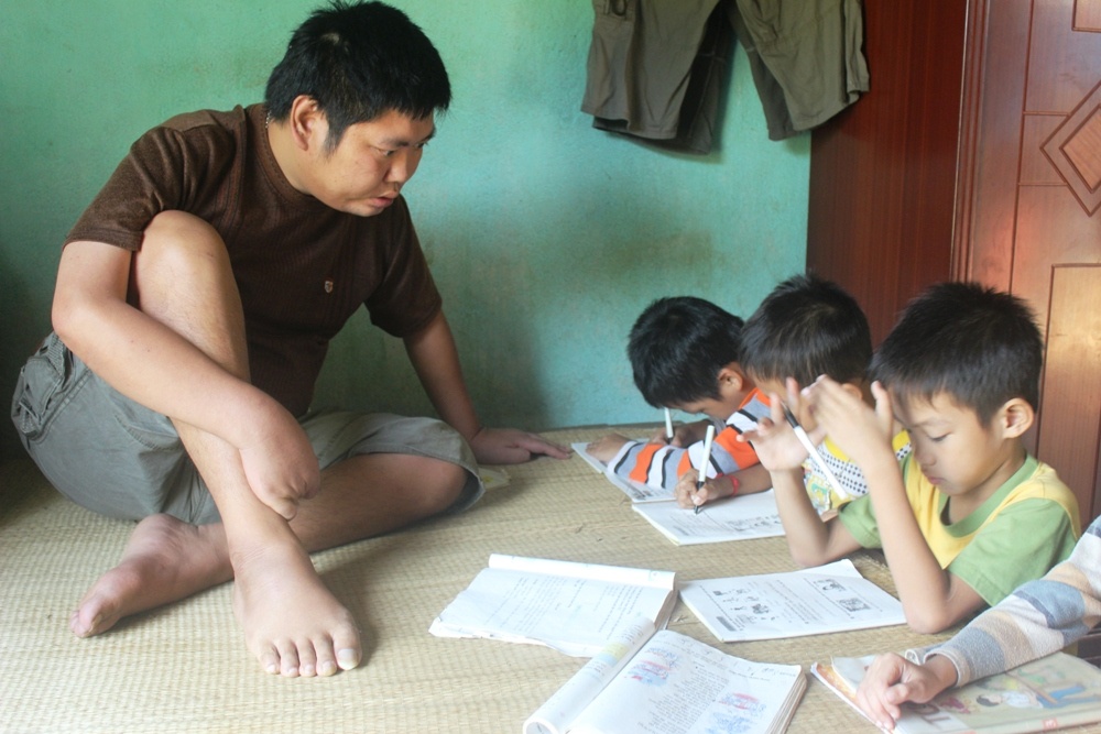 Không gian yên tĩnh giữa núi rừng vang lên những tiếng ê, a tập đọc của các em nhỏ trong căn nhà của anh Bình. Ngôi nhà chỉ rộng 15m2, có gần 20 học sinh độ tuổi khác nhau, ngồi vây quanh chiếc giường của người thầy tật nguyền để học chữ.