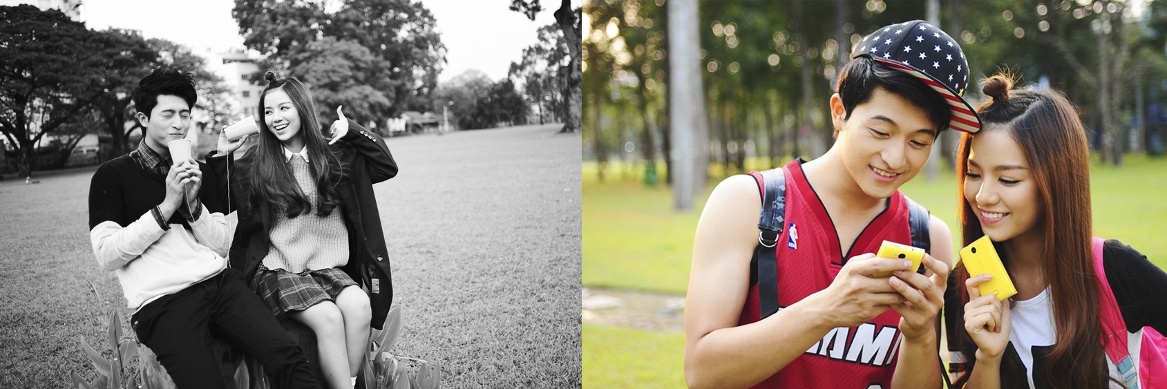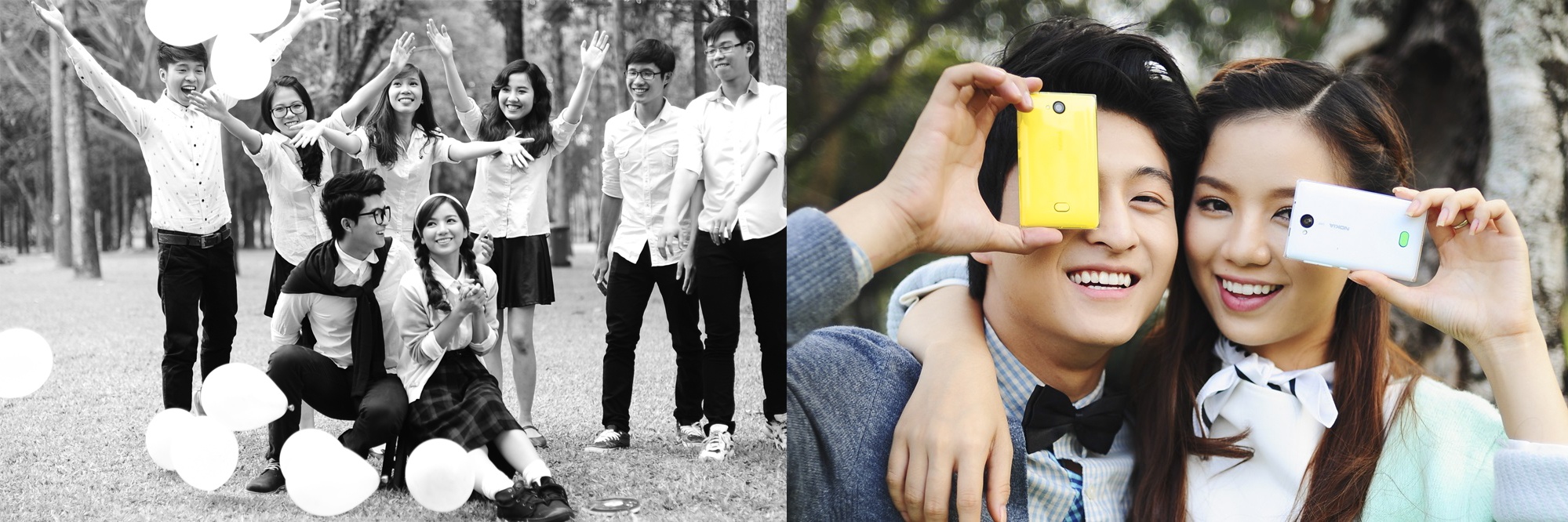 | Bạn có thể vui chơi thoải mái chỉ với chiếc điện thoại Asha 503 màu vàng. Harry chia sẻ: "Dù khá bận với lịch trình làm việc, mình vẫn check Facebook của bạn bè thường xuyên. Mình mới mua một chiếc Nokia ASHA 503 có kết nối 3.5G tốc độ cao và ổn định, nên tha hồ check Facebook, liên lạc với bạn bè mọi lúc mọi nơi". Hạ Anh cho biết thêm: "Khác với hồi cấp 3, đại học là nơi chúng ta có nhiều thời gian ngoài lớp với bạn bè hơn. Khả năng tám của mình tăng dần nhờ các phần mềm miễn phí". |