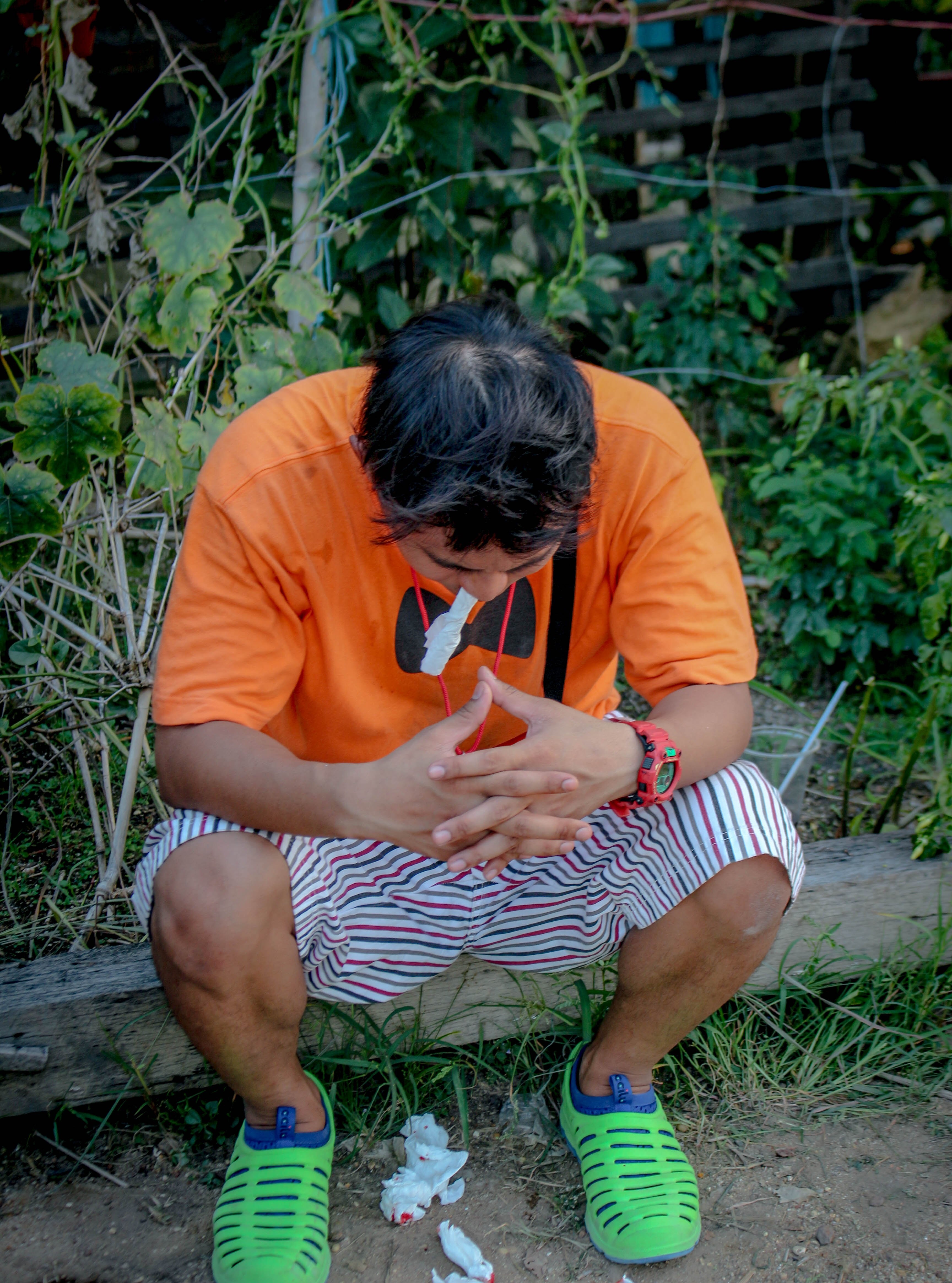 | La Thành ngồi nghỉ sau khi bị chảy máu mũi. |
