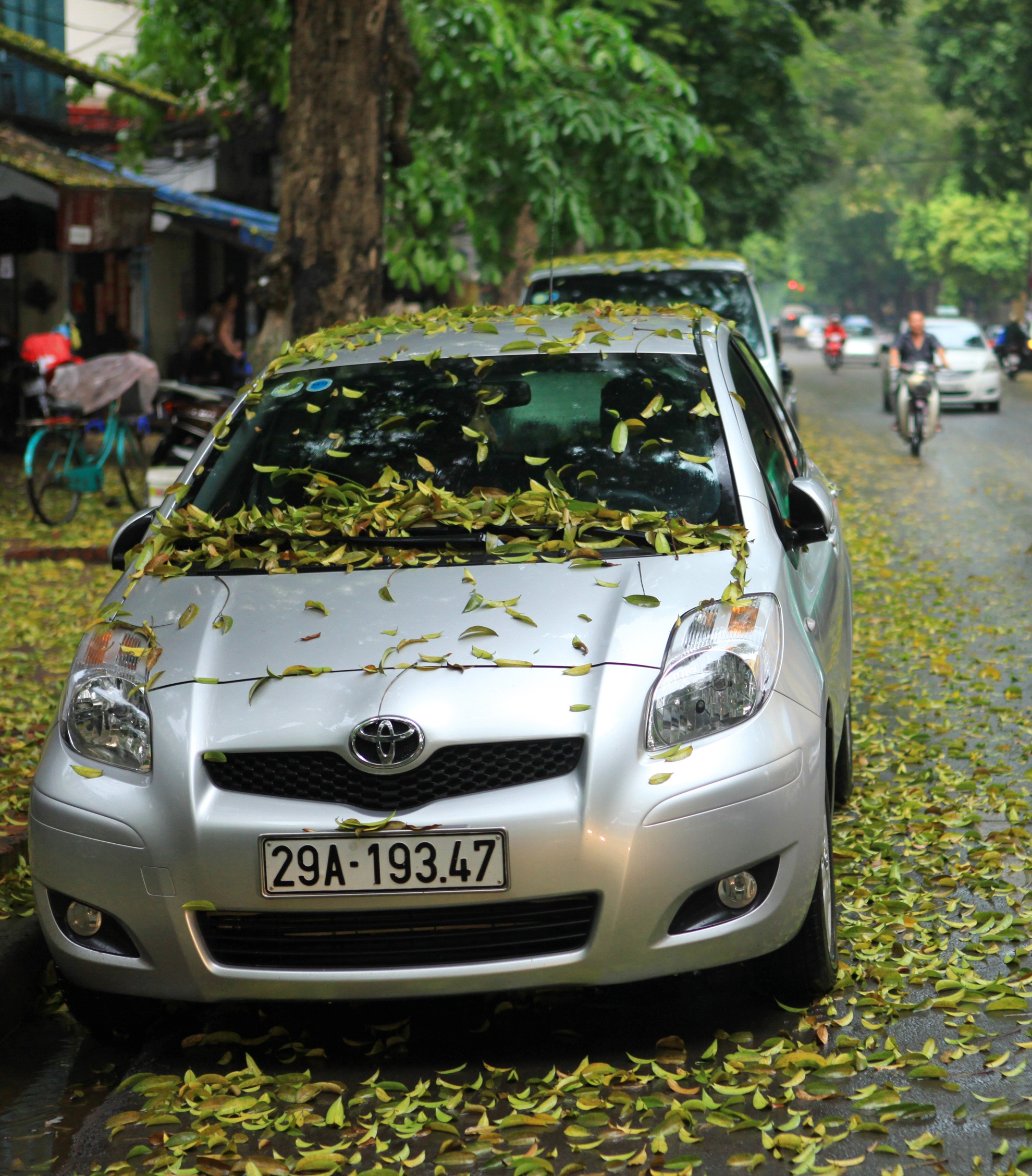 Tại phố Lê Thánh Tông, quận Hoàn Kiếm, một chiếc ôtô chỉ mới đỗ bên lề đường ít phút đã bị lá phủ đầy nóc và kính xe.