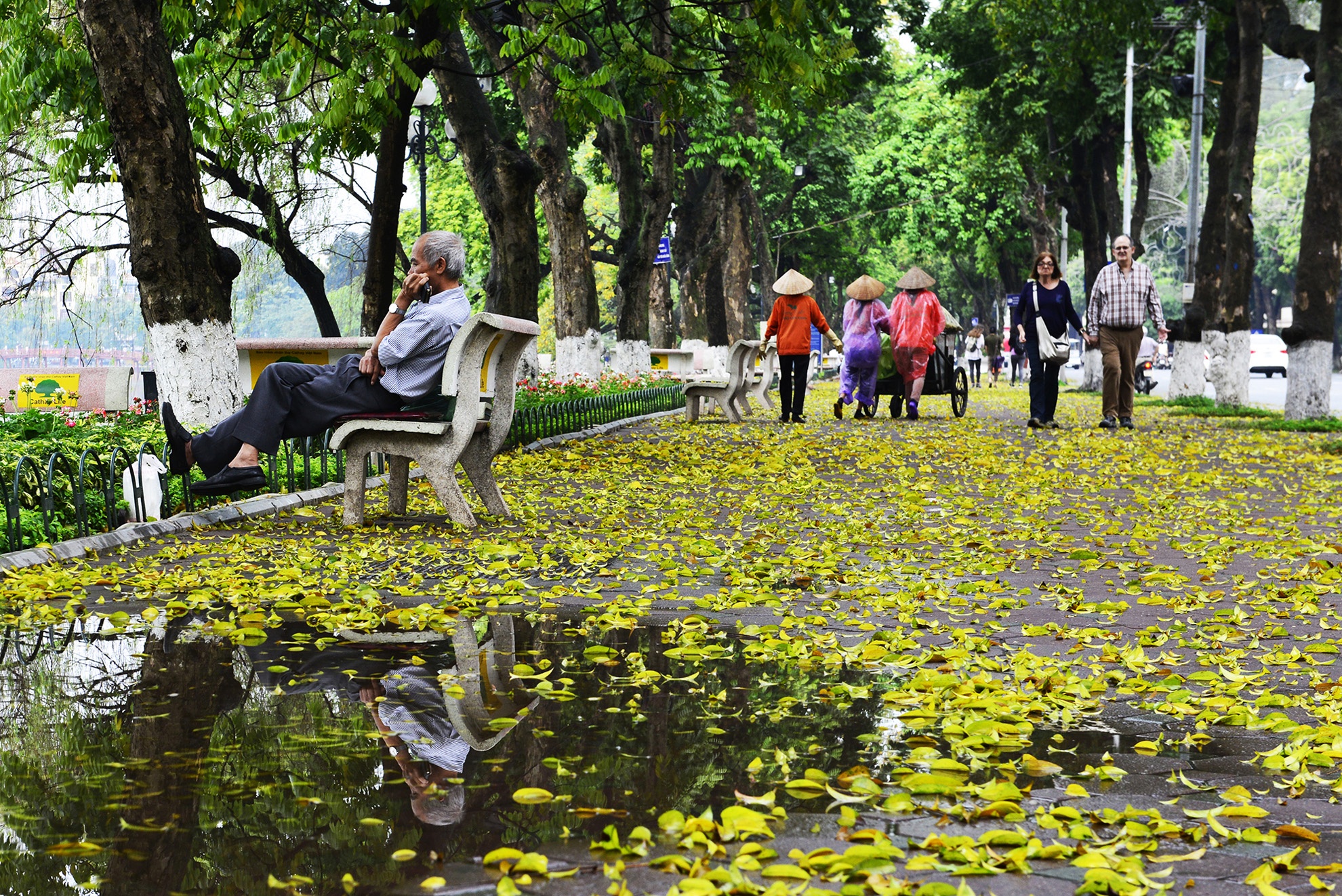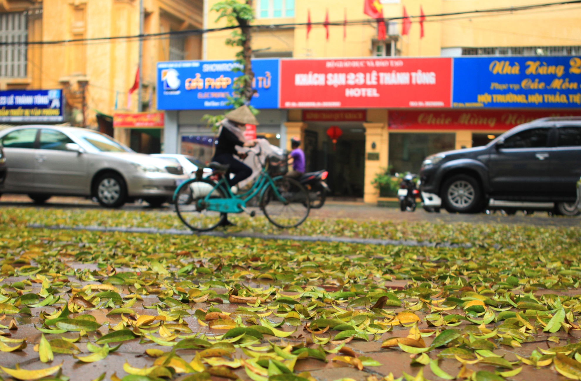 Sáng 7/4, Hà Nội trở lạnh (24 độ C) kèm theo cơn mưa nhỏ khiến cho lá càng rụng nhiều hơn.