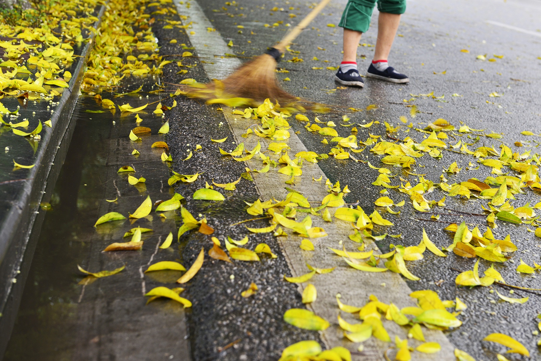 | Chiều 7/4, nhóm công nhân vệ sinh môi trường bắt đầu dọn dẹp những thảm lá bị ướt sũng trên lòng đường.  |