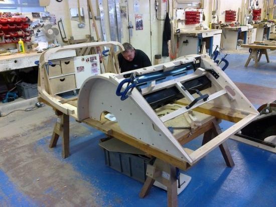 Thân xe được hoàn thiện tại phân xưởng tiếp theo của nhà máy. Gỗ là vật liệu làm nền cho thân xe. Những mảnh gỗ chất lượng tốt nhất được công nhân cắt xẻ trực tiếp bằng tay, dùng keo gắn lại và cố định trên khung chính.