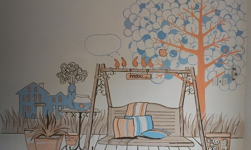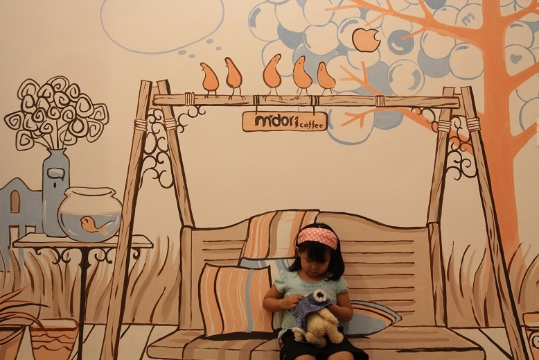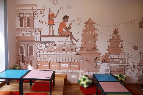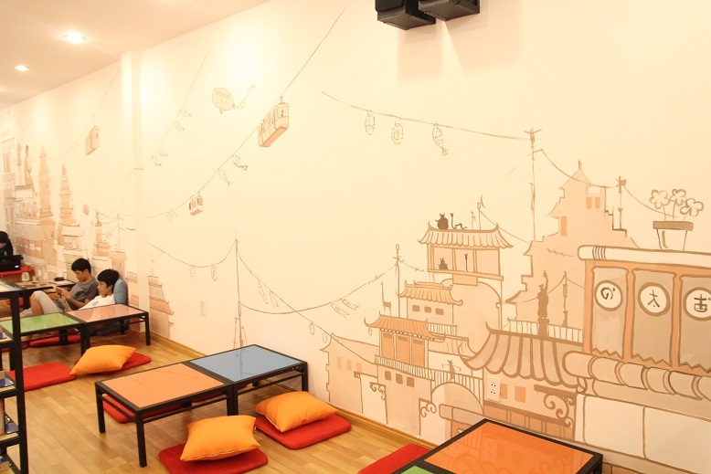 Đầu tiên là những mảng tường với những bức tranh nhiều chủ đề theo phong cách manga như thành phố mộng mơ, nhân vật truyện tranh, góc khu vườn cổ tích, ghế đá công viên, xe đạp, giỏ hoa… Những bức tường này khiến quán không chỉ sinh động hơn, nền nã hơn mà còn là background tuyệt đẹp cho bức ảnh của bạn.