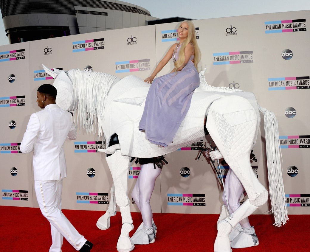 | Năm nay, cô ca sĩ Born This Way cưỡi trên lưng chú ngựa trắng được tạo hình trên lưng 2 người đàn ông. |
