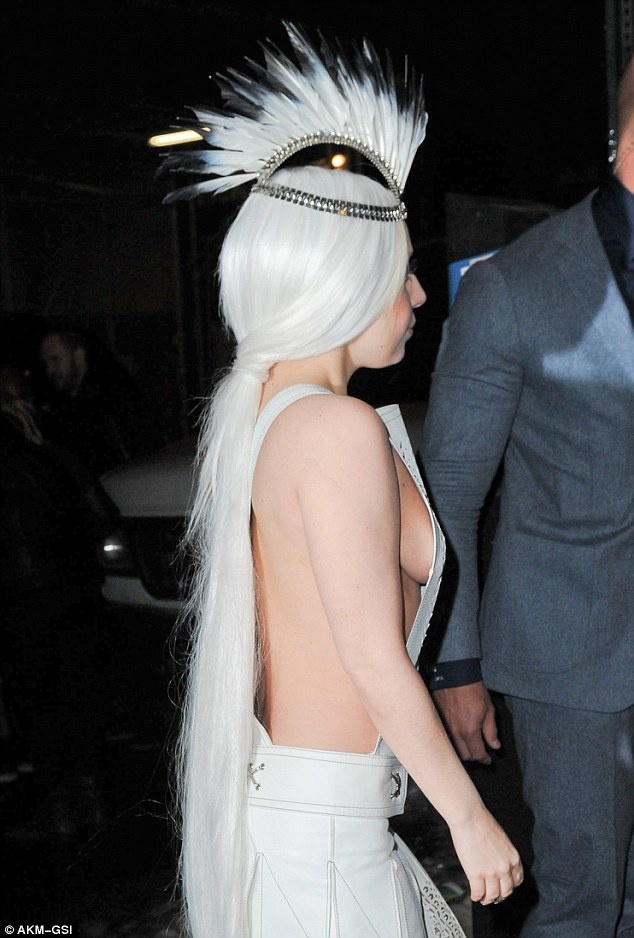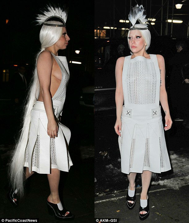 Nổi tiếng với gu thời trang kỳ dị bậc nhất làng showbiz, Lady Gaga mặc váy không nội y, với phần chi tiết lưới phía trước và hở toàn bộ lưng trần giữa trời giá lạnh tại Mỹ.
