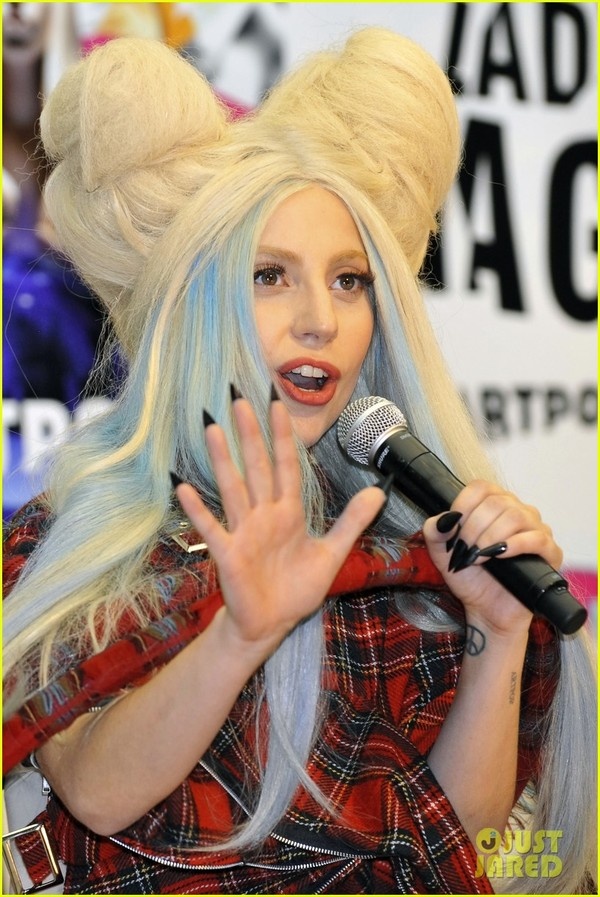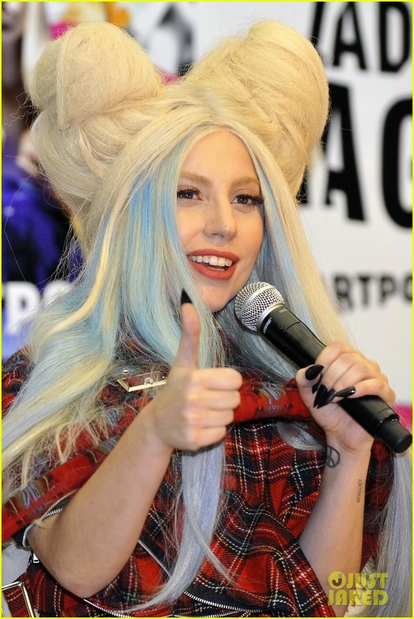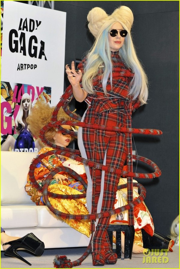 | Trước đó, Lady Gaga đã có mặt ở Tokyo (Nhật Bản) để quảng bá sản phẩm âm nhạc mới nhất. Cô để kiểu tóc và mặc trang phục màu đỏ trông khá kỳ lạ và độc đáo. |
