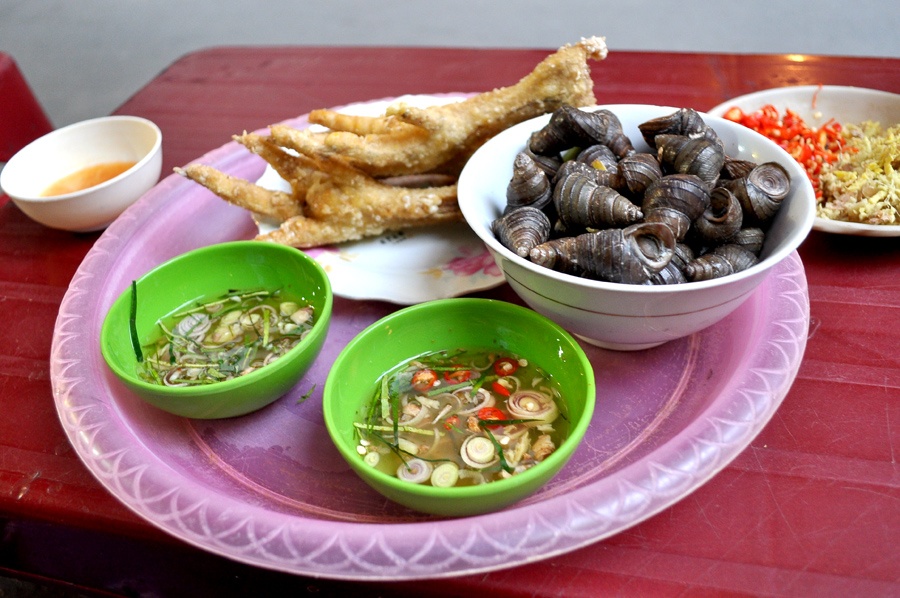 Nhìn chung các món của quán làm đều tay, chấm được điểm khá. Món chuẩn nhất là chân gà chiên, rất xứng đáng để “gây nghiện” cho nhiều thực khách, nhất là những người có sở thích gặm nhấm, lai rai. Nhưng phải lưu ý, quán này vỉa hè, bình dân mà giá không hề rẻ. Chân gà 12.000 đồng/chiếc, dù chân loại to song vẫn là “chát” so với nhiều nơi. Nem chua 5.000 đồng/cái cũng bé hơn mọi quán phổ biến. Đặc biệt, ốc luộc rất đắt – 25.000 đồng/bát mà chiếc bát nhỏ nhỏ xinh xinh, chỉ nhỉnh hơn bát ăn cơm chút ít.
