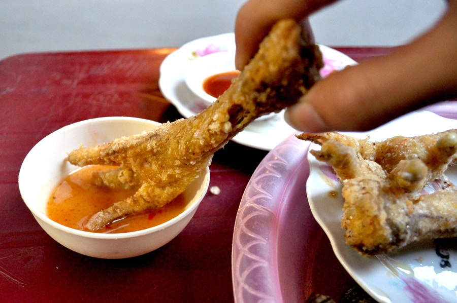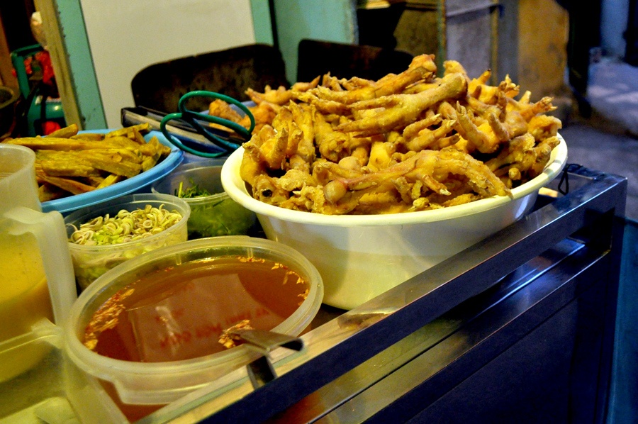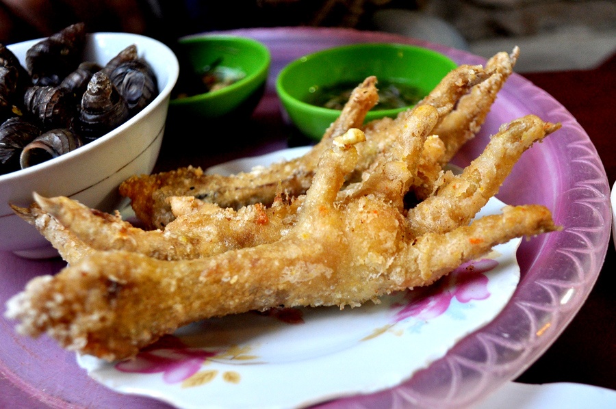 Thực đơn quán khá phong phú. Chủ quán chuẩn bị đồ trông ngon mà sạch sẽ, rất vừa ý khách. Món tủ có lẽ là chân gà chiên giòn. Chân gà to đã được chiên qua, xếp sẵn đầy ắp một chậu, khách đến gọi chủ quán cho vào chảo ngập mỡ chiên qua một lần nữa cho nóng giòn. Cũng giống như nhiều món, chân gà chiên 2 lửa càng ngon. Chiếc chân vàng rộm, phần da giòn tan, phần gân sần sật gặm đến đâu “sướng miệng” đến đó. Nước chấm chân gà pha cực ngon, hơi chua chua nên bớt cảm giác ớn ngấy cho món chiên rán, làm khách gặm chân “tì tì” chẳng biết chán.