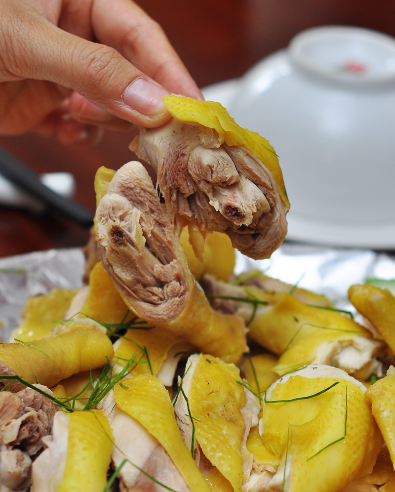 Gà đủ nguyên con, hấp chín tới có lớp da vàng óng. Món này khách nên thưởng thức khi vẫn còn tỏa khói để cảm nhận hết độ ngon ngọt của giống gà mía với loại thịt săn chắc.