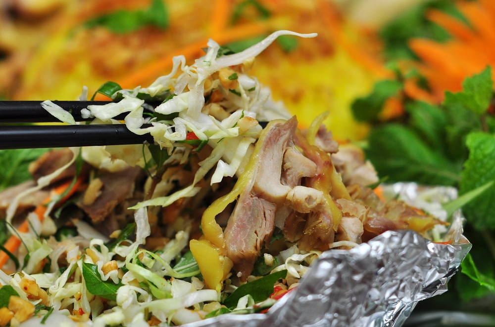 Nộm gà có tác dụng giải ngấy, đưa đẩy bữa ăn. Nộm bắp cải trộn vừa miệng, lại kết hợp cùng phần thịt đùi ngon tuyệt. Món nộm thường xuyên khiến các nhóm khách phải thòm thèm vì nhanh chóng hết veo.