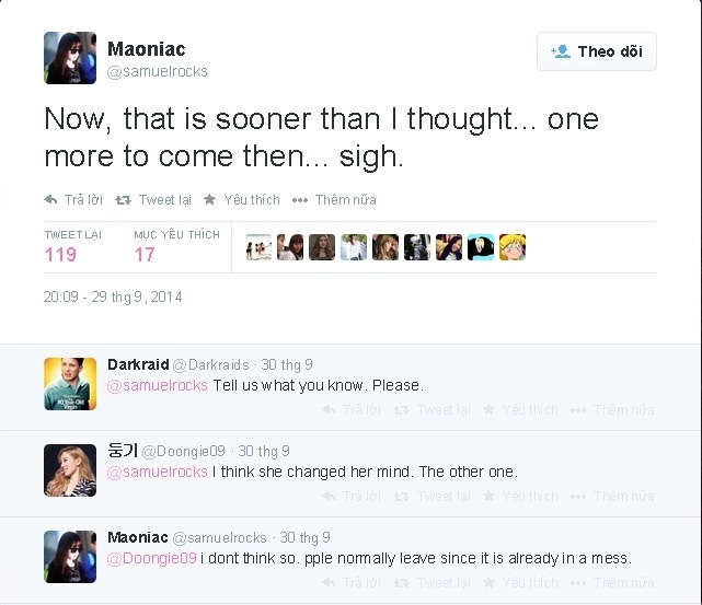 Samuelrocks còn gây chú ý qua đoạn trò chuyện với một tài khoản khác với phần bình luận. Người bạn viết: “Tôi nghĩ cô ấy đã đổi ý rồi. Người kia ấy”. Samuelrocks đáp lại: “Tôi không nghĩ vậy. Người ta thường rời đi khi sự tình đã rối tung”.