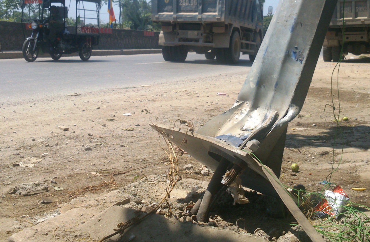 | Chiếc xe tải chỉ dừng lại khi húc vào cột điện bên đường. Ảnh: Việt Đức. |