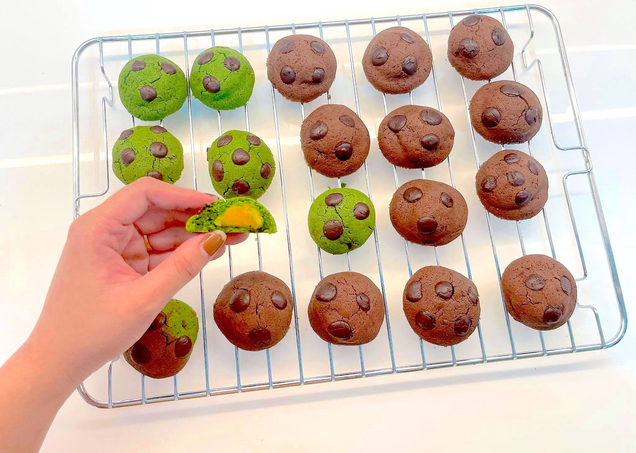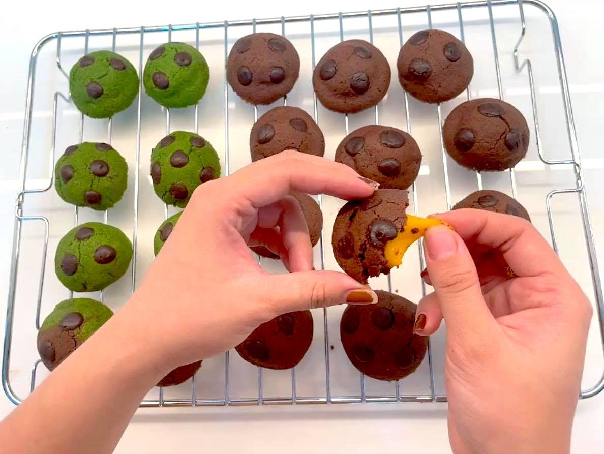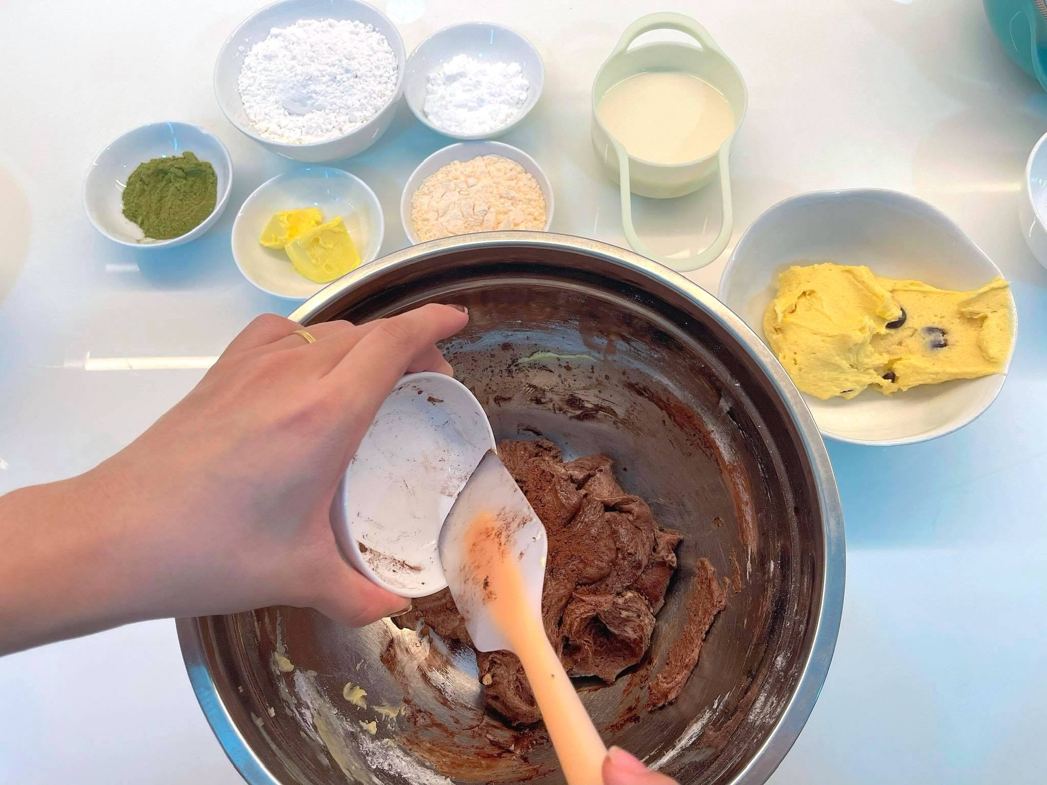 - Kết hợp trộn chocolate chip và rắc bột matcha, cacao pha màu cho vỏ bánh.