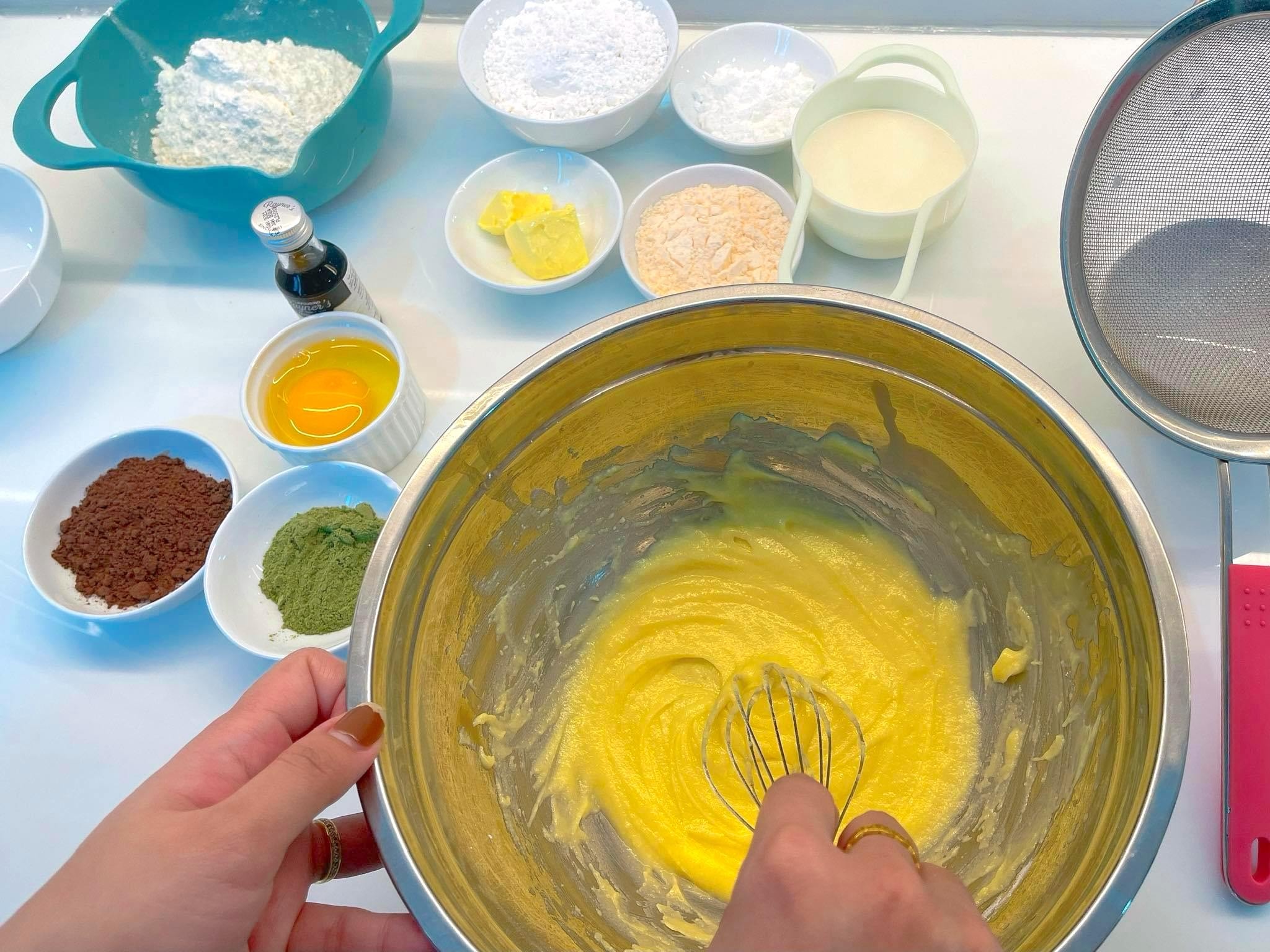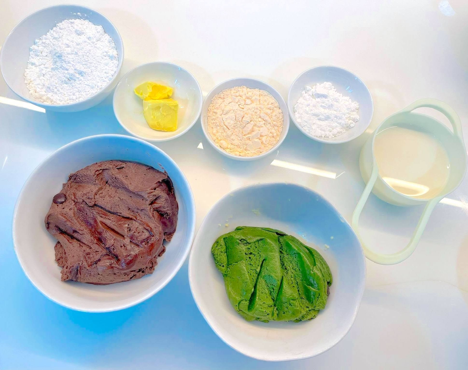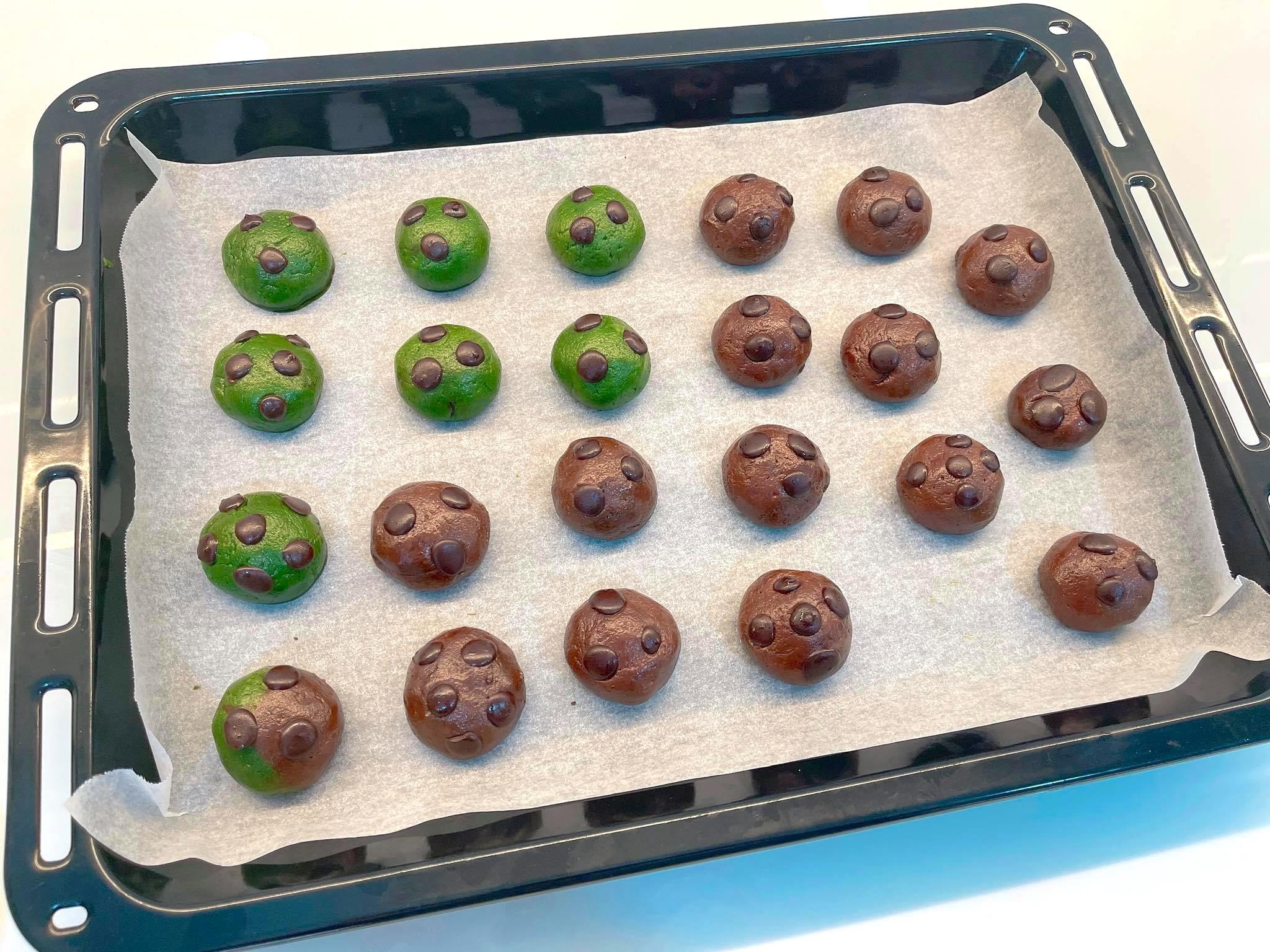 - Kết hợp trộn chocolate chip và rắc bột matcha, cacao pha màu cho vỏ bánh.