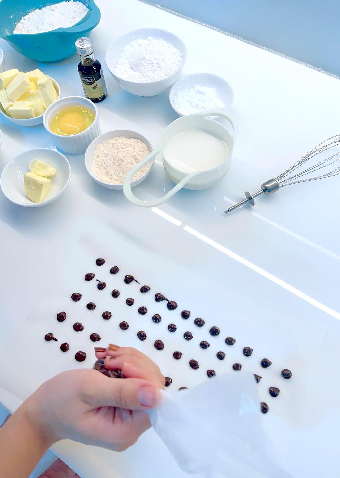 - Trang trí thêm chocolate chip. Không ấn bánh quá dẹp vì trong lúc nướng bánh sẽ còn chảy ra.