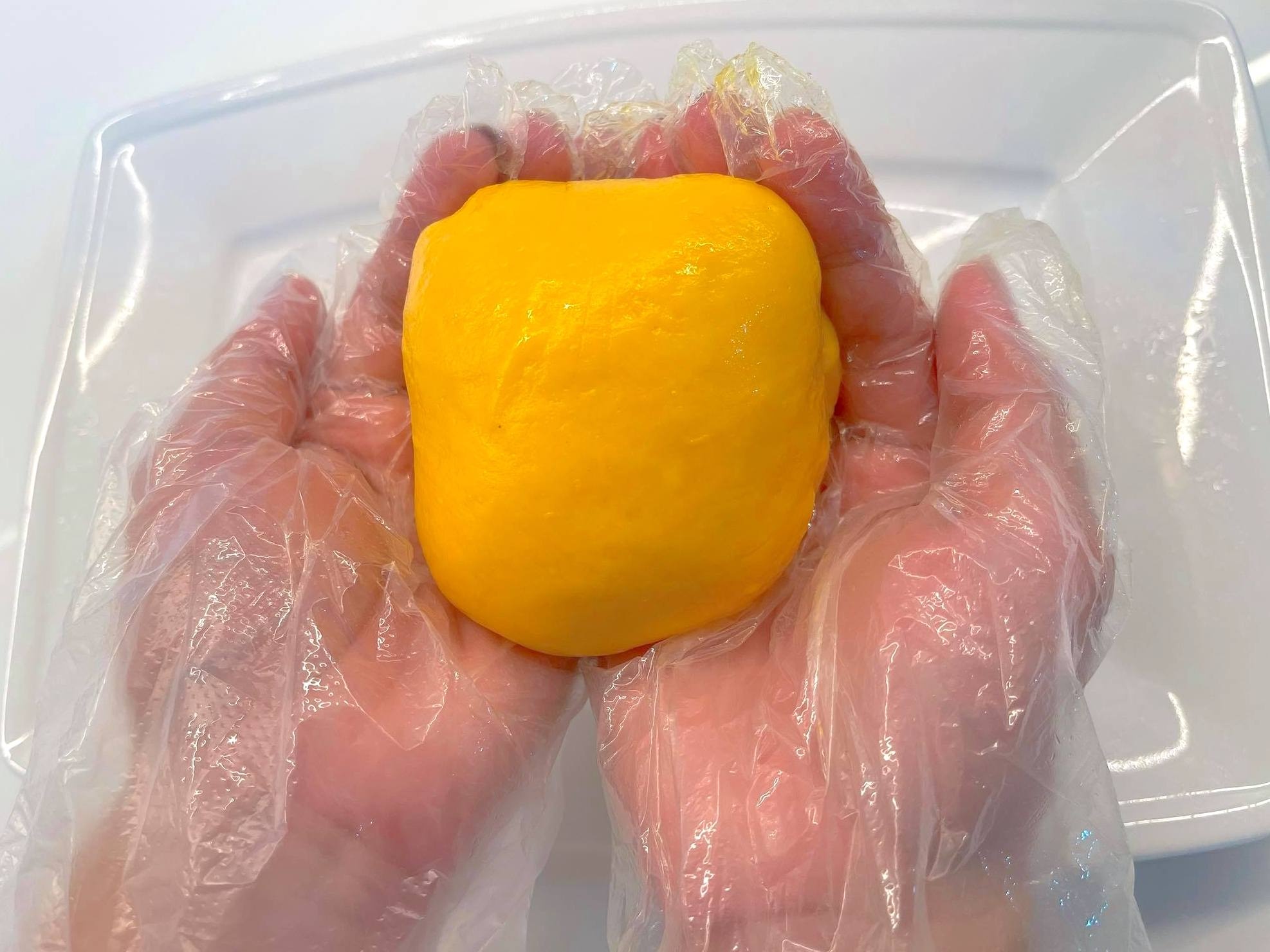 - Lấy ra khỏi lò, trộn bơ lạt vào, dùng bao tay nhồi đều thành khối thật mịn sẽ có được phần nhân mochi.