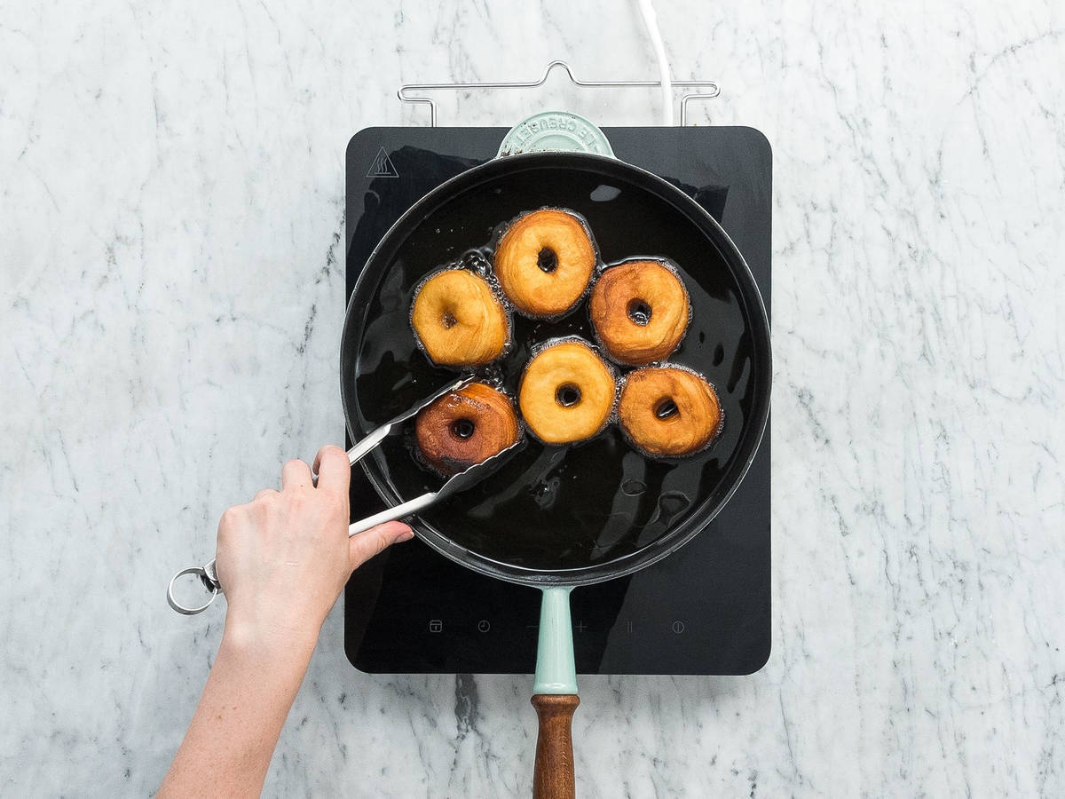 - Trong chảo sâu lòng, đun nóng dầu, chiên bánh 2-3 phút đến khi chín vàng hai mặt.