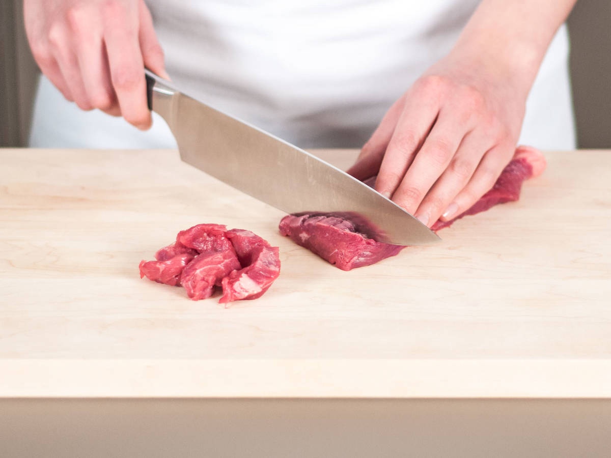 - Cắt lát thịt bò thành từng miếng dày khoảng 2 cm.