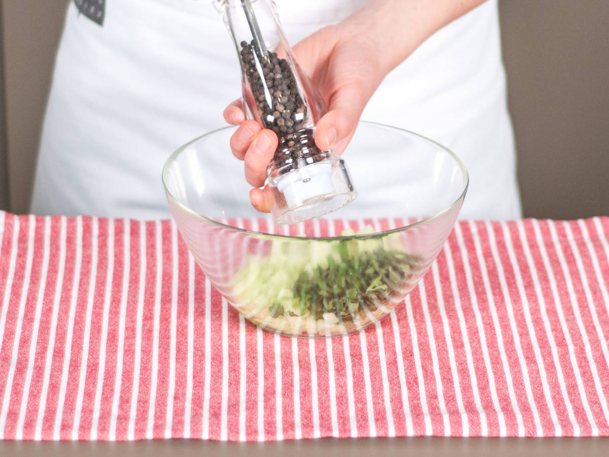 - Trộn một nửa số ngò cắt nhỏ và dưa chuột thái hạt lựu trong tô lớn.