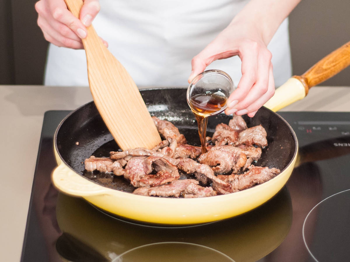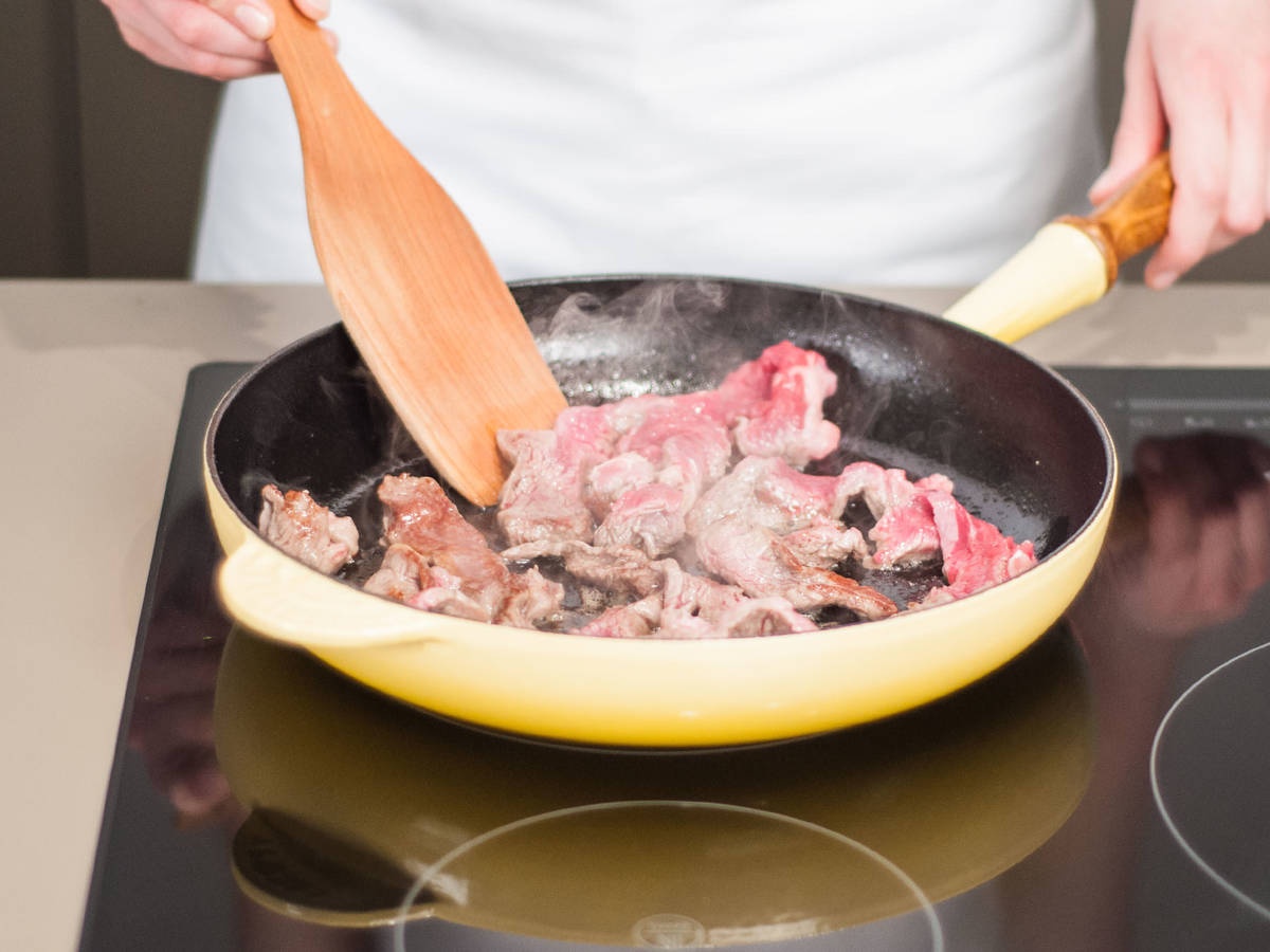 - Áp chảo thịt bò với ít dầu thực vật ở mức lửa vừa khoảng 5-7 phút đến khi thịt chuyển màu nâu.