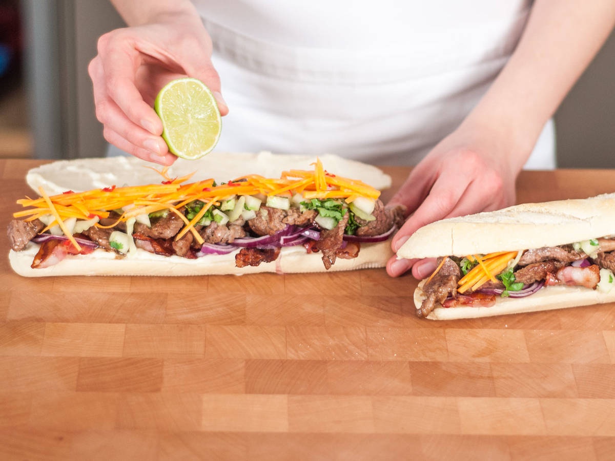 - Kẹp nhân thịt xông khói, thịt bò, các loại rau củ vào ổ bánh mì.