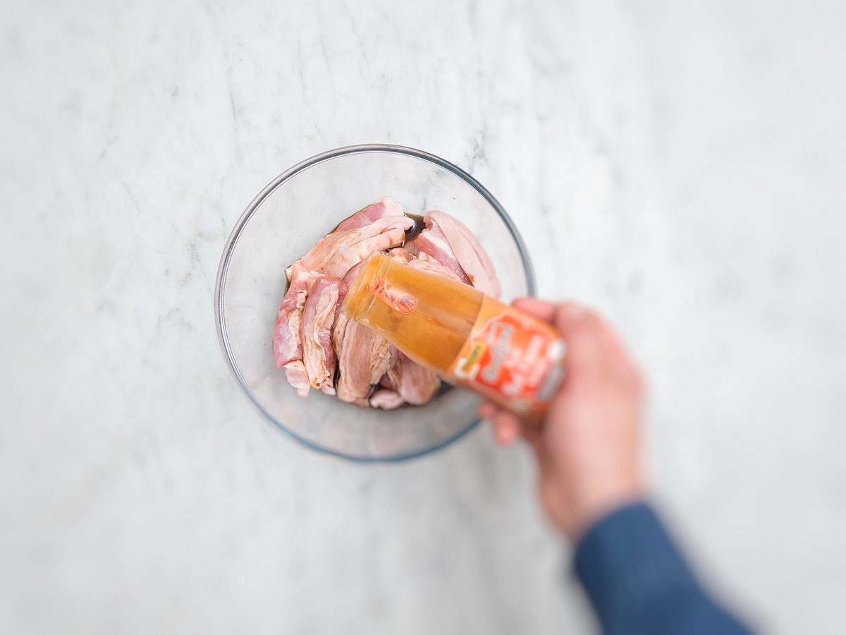 - Chuẩn bị bát lớn, trộn nước tương và nước sốt cà ri đỏ của Thái, sau đó thêm thịt lợn thái mỏng vào ướp.