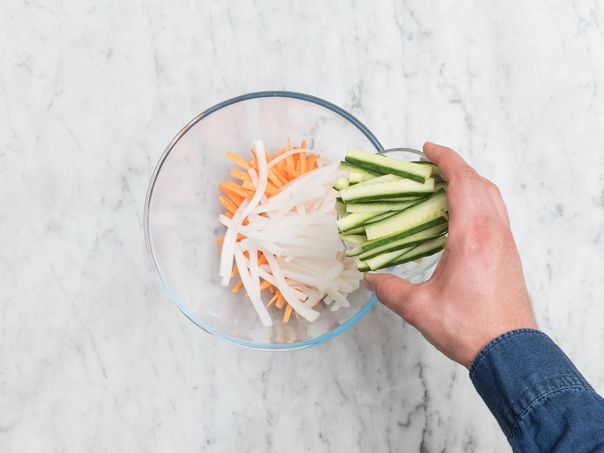 - Bào sợi củ cải trắng, cà rốt và dưa chuột.