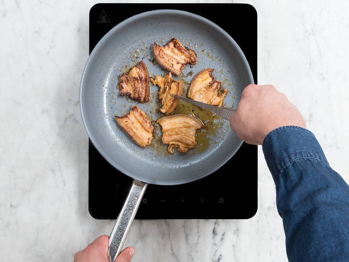 - Thêm thịt ba chỉ đã ướp gia vị vào chiên đều hai mặt (khoảng 2-3 phút mỗi bên).