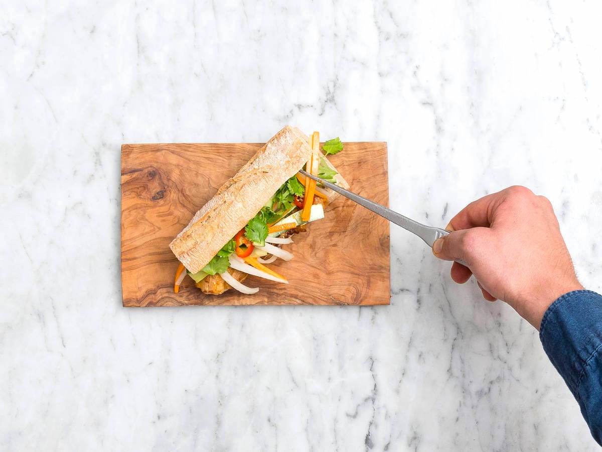 - Phết nước sốt cà ri đỏ Thái vào hai mặt trong của ổ bánh mì.