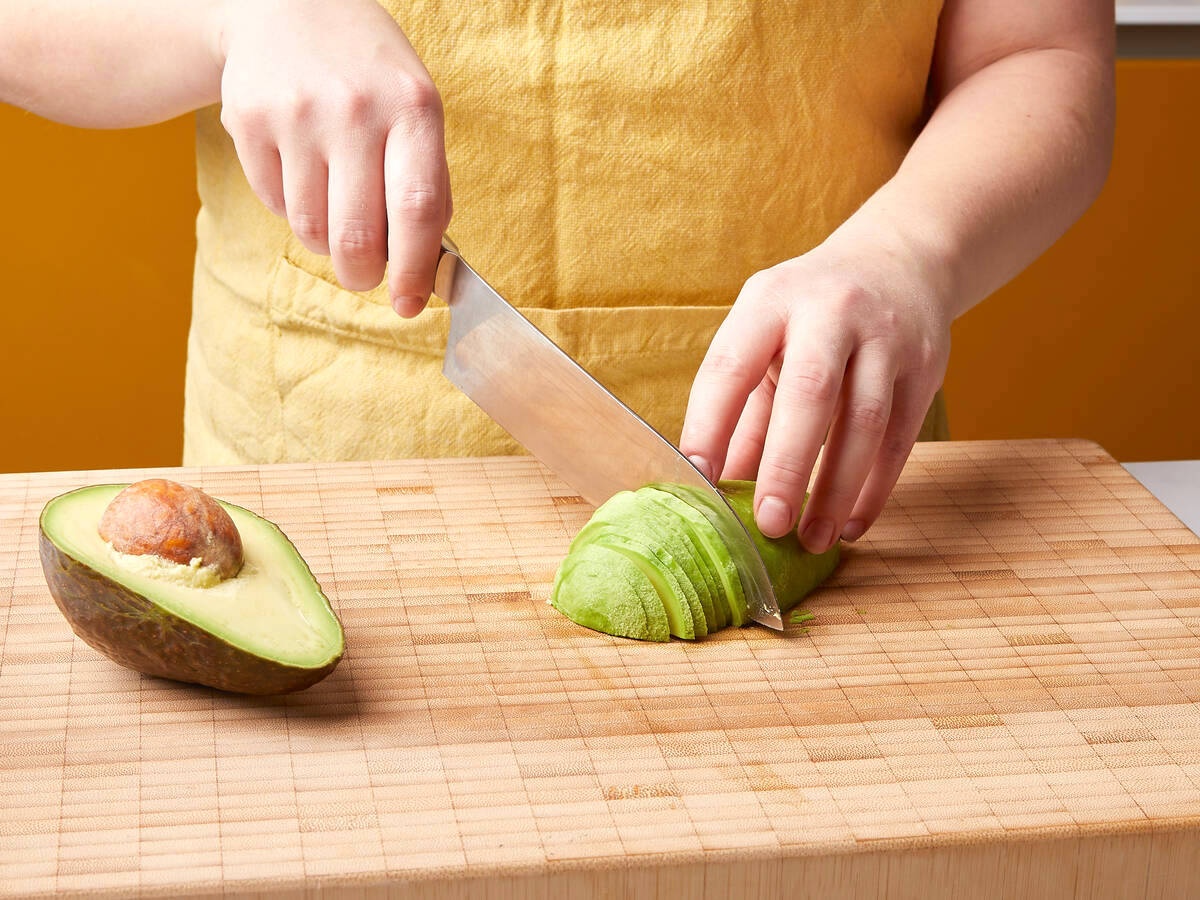 - Cắt đôi quả bơ, thái bơ thành từng lát và rưới nước cốt chanh lên trên.
