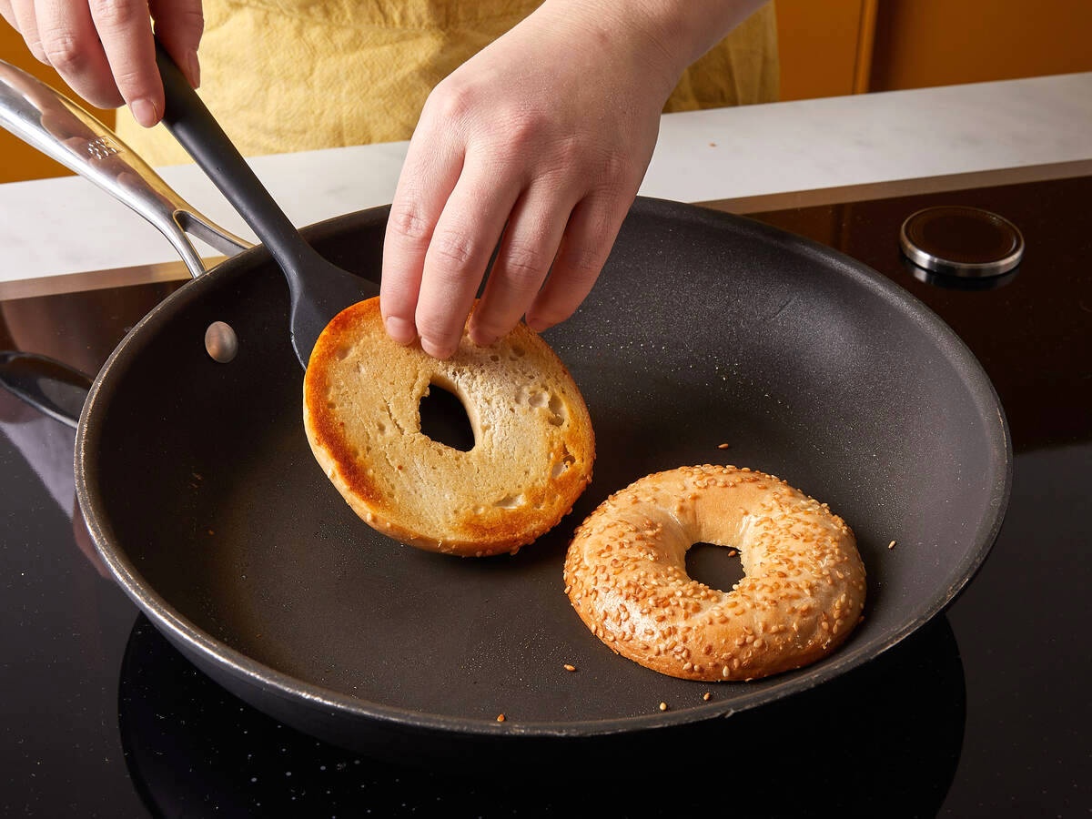 - Thêm bánh mì vòng vào chảo và nướng sơ qua các mặt.