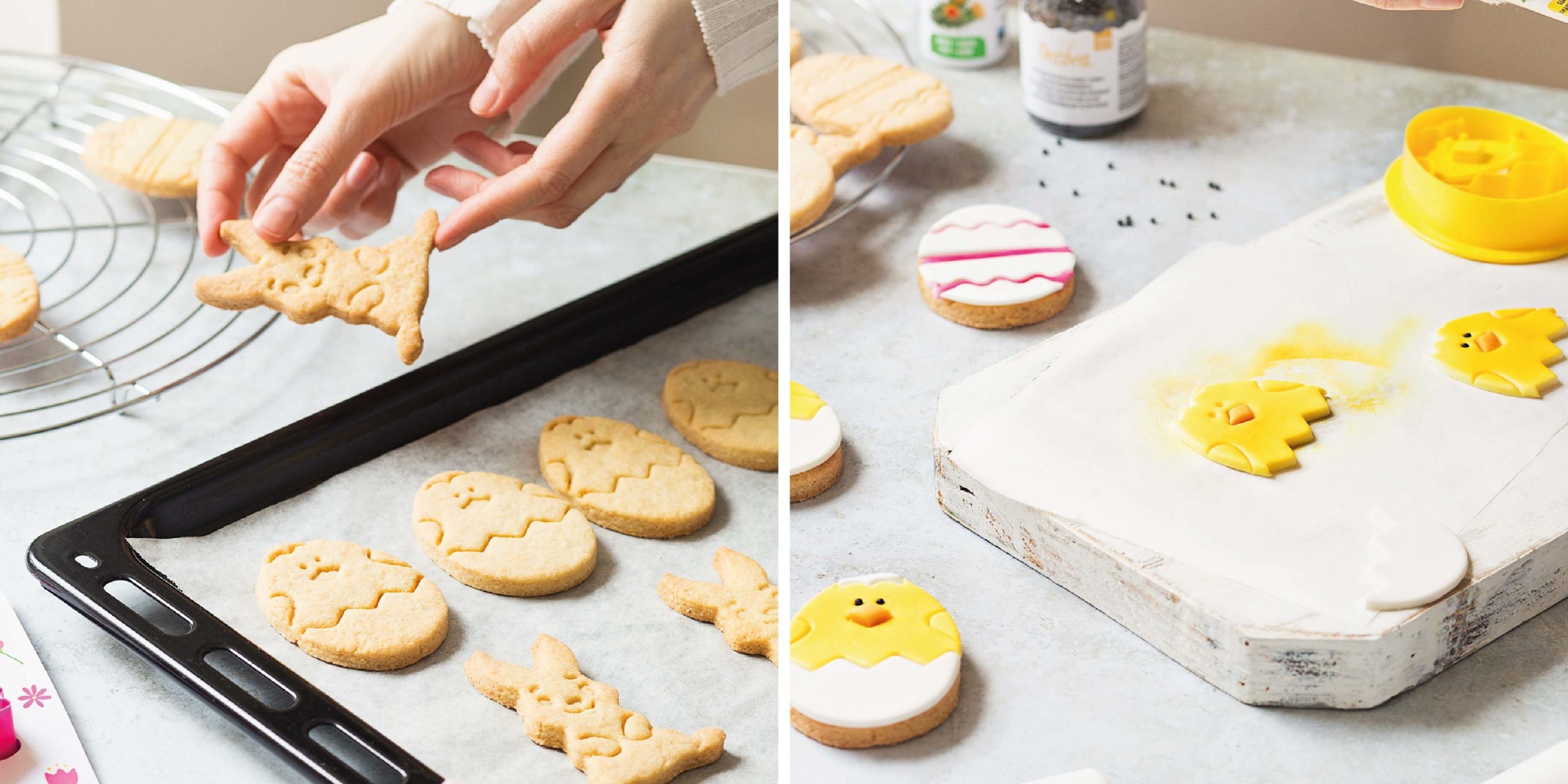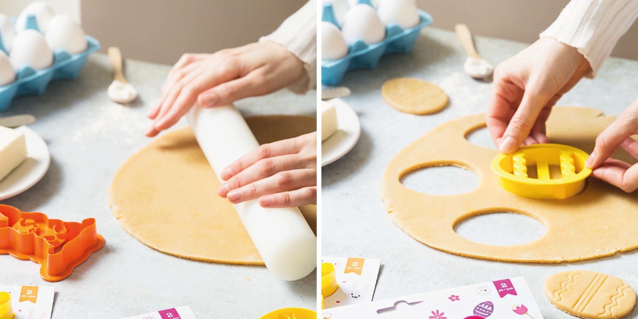 - Lấy bột ra, dùng cây lăn cán mỏng bột và tạo hình bánh quy bằng khuôn có họa tiết liên quan lễ Phục sinh.