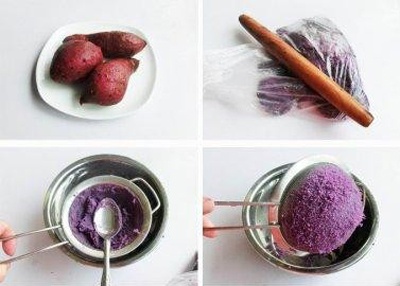 Hấp chín khoai, bỏ vỏ rồi giã nhuyễn. Sau đó, bạn lọc khoai qua rây để loại bỏ xơ. Xong xuôi, để khoai vào ngăn mát của tủ lạnh khoảng 30 phút.