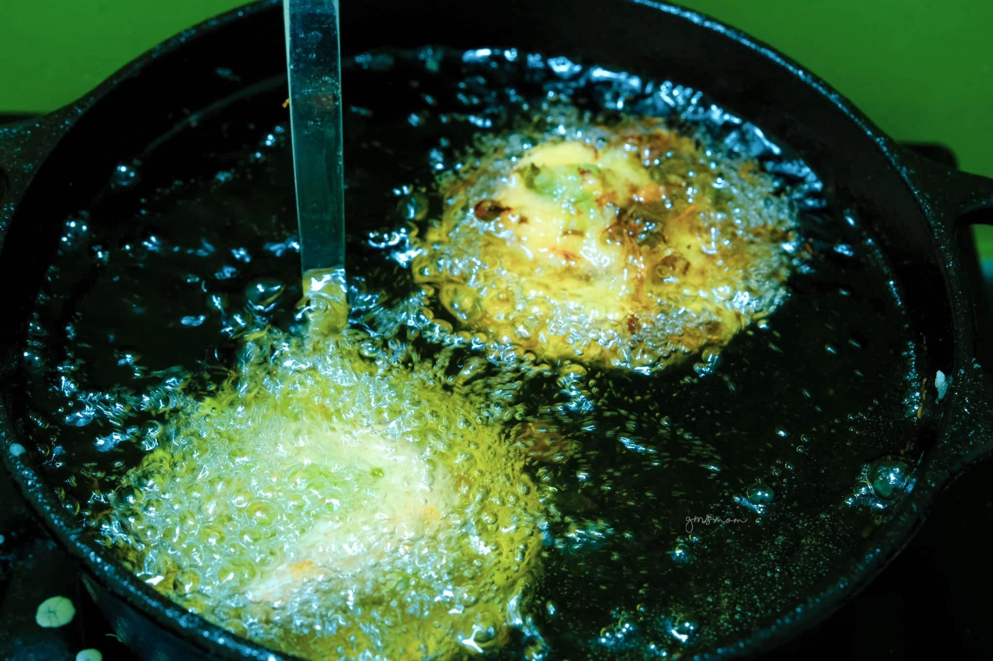 - Giữ vá bánh trong nồi dầu sôi, khi bánh được chiên vàng sẽ tự động tách khỏi vá, vớt bánh ra để ráo dầu là hoàn thành.