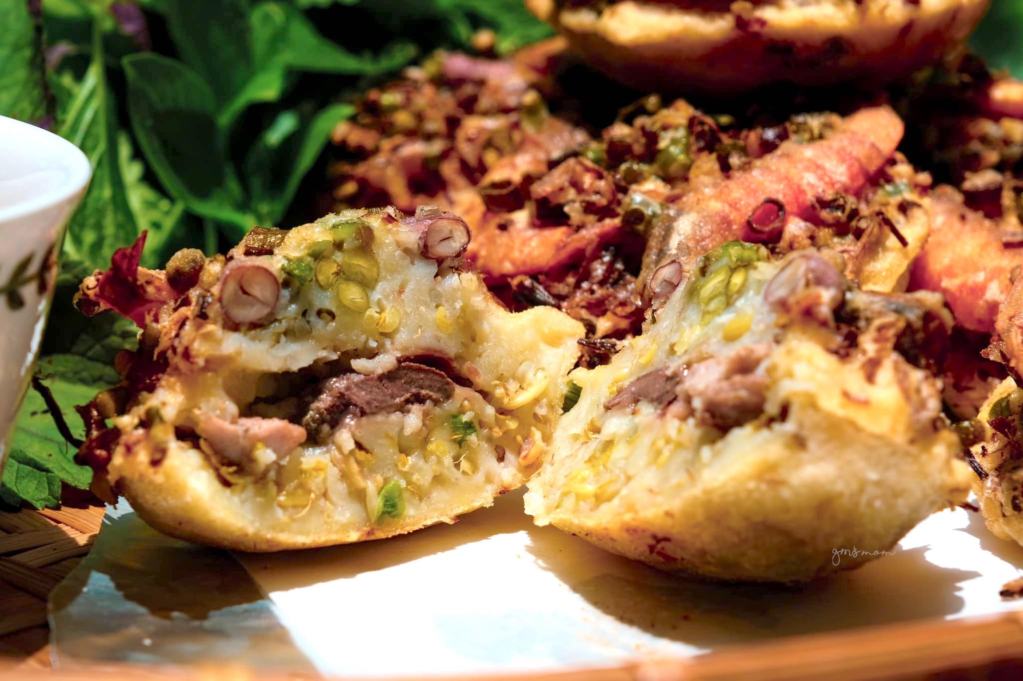 Thoạt nhìn, bánh giá khá giống bánh cống của Sóc Trăng, lại có nét tựa bánh tôm Hồ Tây. Tuy nhiên, nhân bên trong cực kỳ phong phú, có vị giòn mát của giá, bùi béo của gan, thịt, hương thơm phảng phất nhờ đậu phộng và đậu xanh. Người thưởng thức nhâm nhi bánh khi còn ấm nóng kèm chút nước mắm chua ngọt và rau sống. Khẩu phần khá chất lượng, chỉ cần ăn tầm 2 bánh là no.