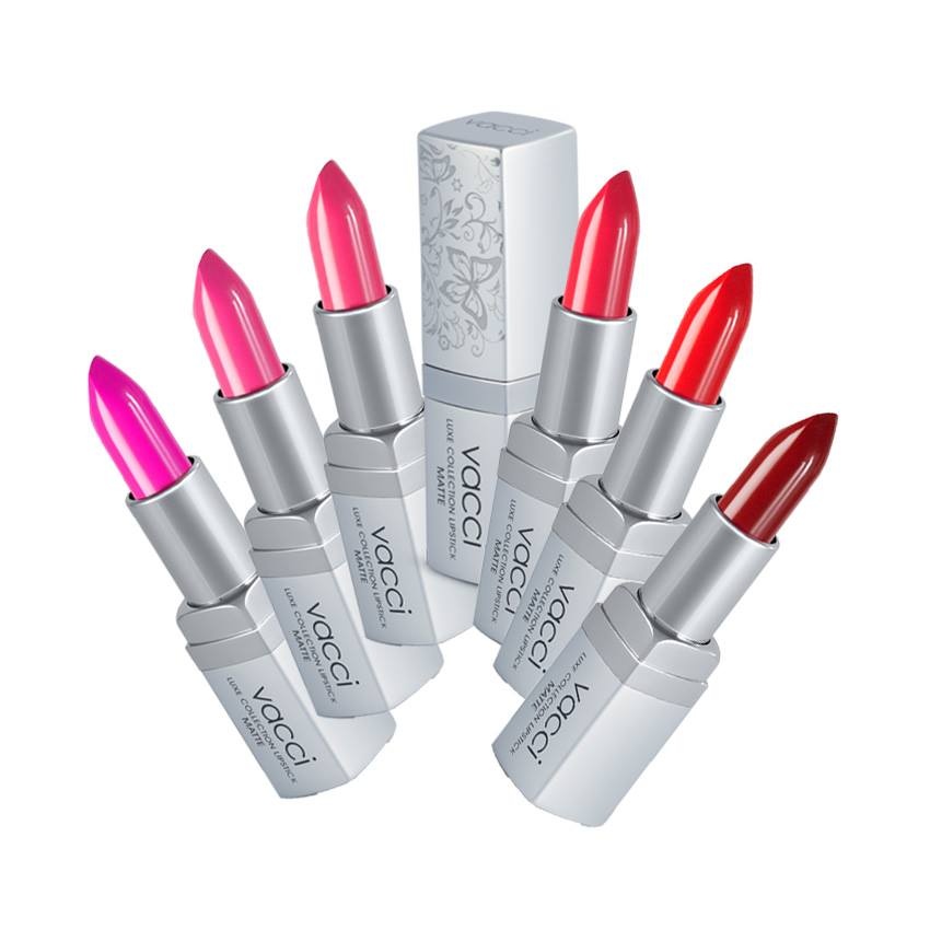 2. Son lì (matte) hiệu Vacci với bộ sưu tập 6 sắc màu phong phú phù hợp với tất cả phong cách từ táo bạo, quyến rũ đầy vẻ quyền lực đến phong cách ngọt ngào, nữ tính, nhẹ nhàng đáng yêu. Son được chiết xuất từ trái cây thiên nhiên và thành phần đa dưỡng chất nhẹ nhàng bao bọc đôi môi cho làn môi mềm mịn. Khả năng chống oxy hoá và các chỉ số chống nắng giúp bảo vệ môi, chống thâm và nhăn môi. Khả năng lưu giữ màu lâu bền hoàn hảo.