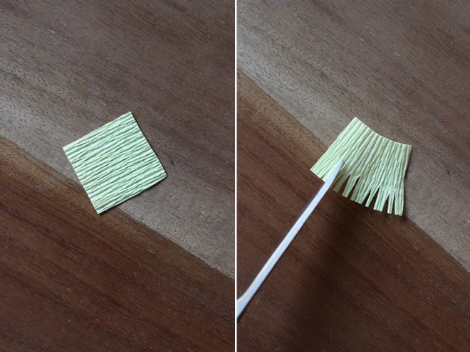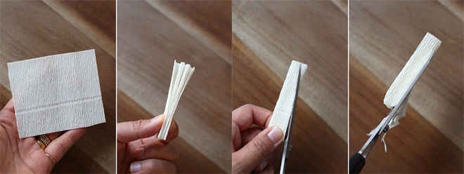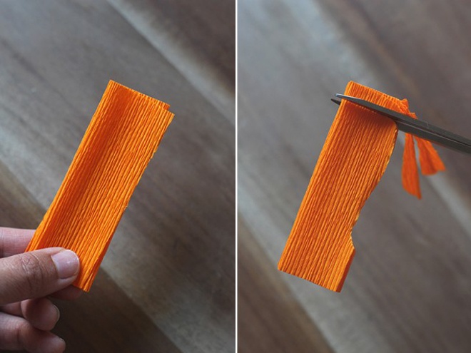 | Cắt tờ giấy cam, hồng và xanh nhạt thành đoạn ngắn, dùng kéo bấm một đầu của tờ giấy thành từng sợi tua rua nhỏ để làm phần nhụy hoa. |