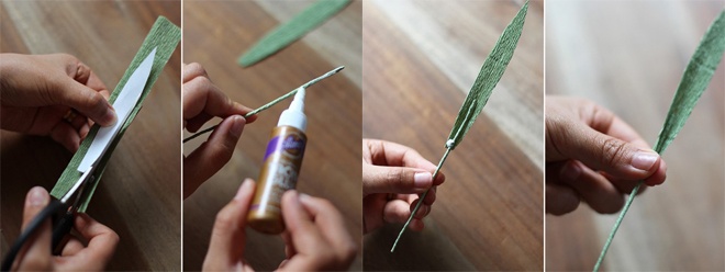 | Cho keo lên 1 mặt của tờ giấy và cuốn vòng quanh sợi dây xanh làm cành hoa, sau đó cắt phần giấy thừa. |