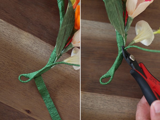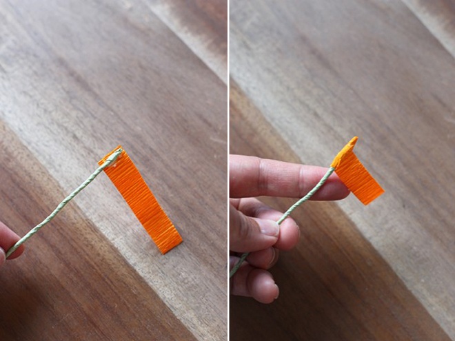 | Quấn giấy màu cam, hồng và xanh nhạt vừa cắt vào phần cành hoa để tạo nên những chiếc nhụy xinh xinh. |