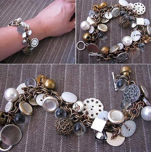 | Những chiếc cúc áo với đủ kiểu dáng và sắc màu sẽ trở thành một món đồ phù kiện độc đáo và ấn tượng nếu như bạn gái chịu khó đầu tư một chút công sức và sự sáng tạo. Nếu bạn đã có sẵn những chiếc móc tròn bằng kim loại thì tốt, bạn có thể bắt tay vào công việc làm vòng tay từ những chiếc cúc áo ngay được. Chỉ cần xuyên những chiếc cúc áo qua móc rồi liên tục móc chúng kết nối lại với nhau, bạn sẽ có một thành phẩm như y. Chiếc vòng của bạn 'độc và lạ' thế nào còn phụ thuộc vào độ khéo léo và sự cá tính của bạn trong khi sáng tác nữa.  |
