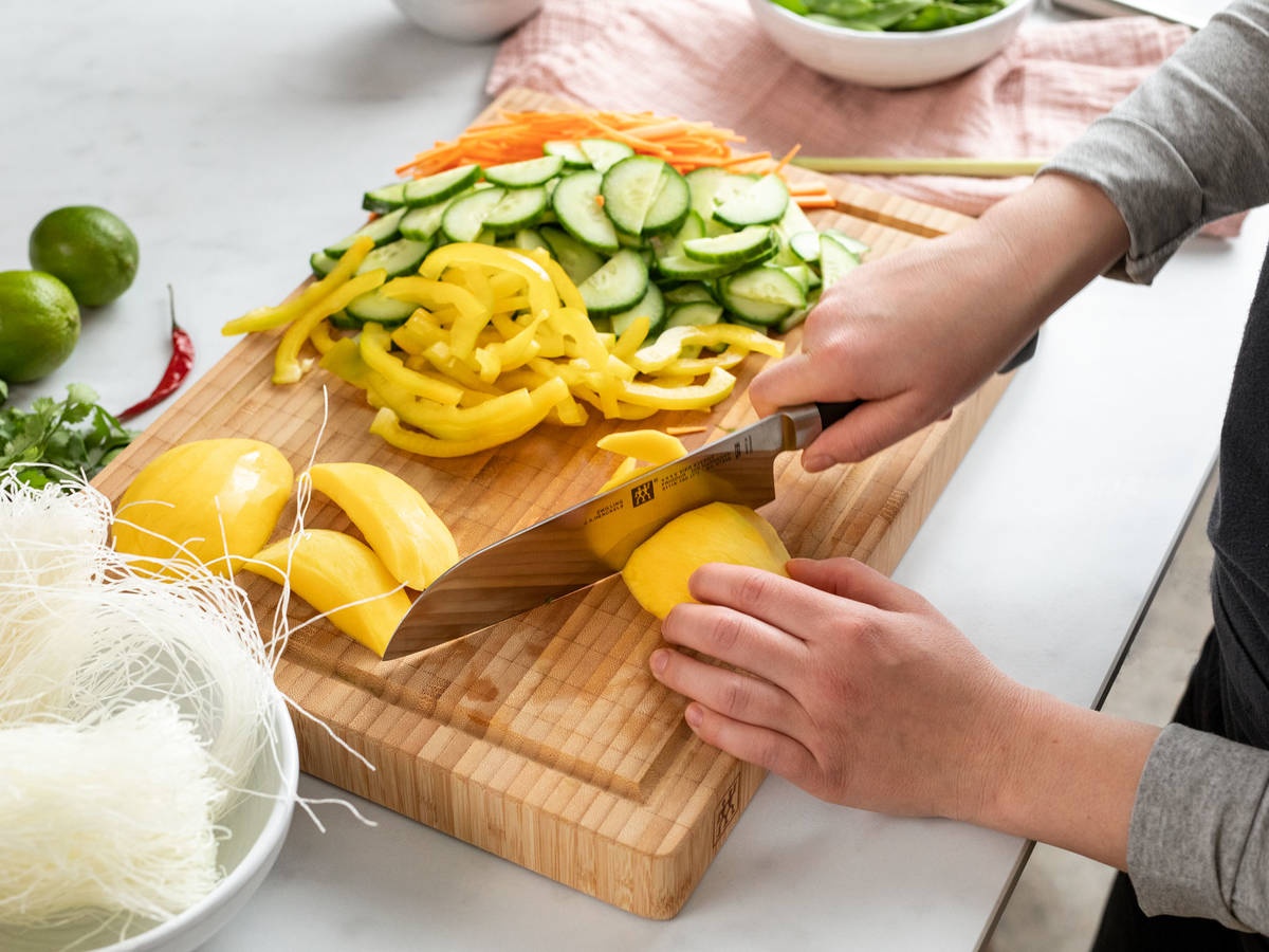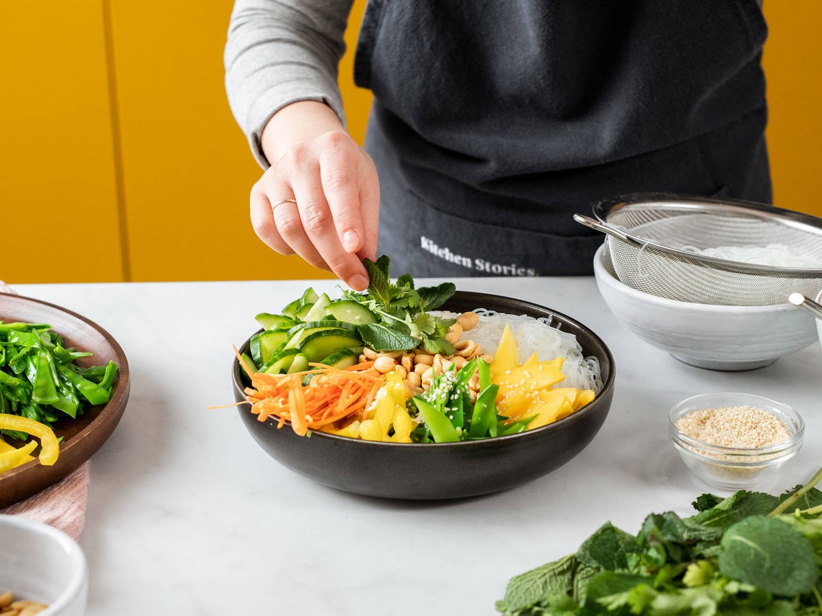 - Chia hủ tiếu ra đĩa, thêm dưa leo, ớt chuông, cà rốt, xoài và rưới thêm nước sốt. Trang trí món ăn với lá bạc hà tươi, ngò, đậu phộng, mè.