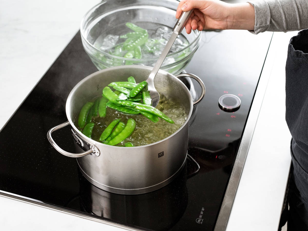 - Đun sôi một nồi nước muối. Chần đậu tuyết khoảng 30 giây, sau đó để ráo, nguội, rồi cắt lát xéo.