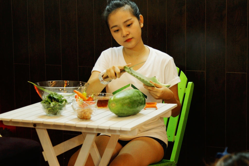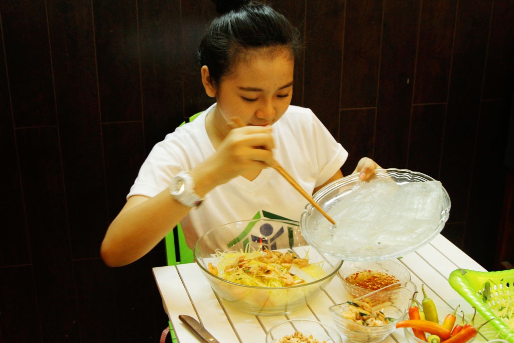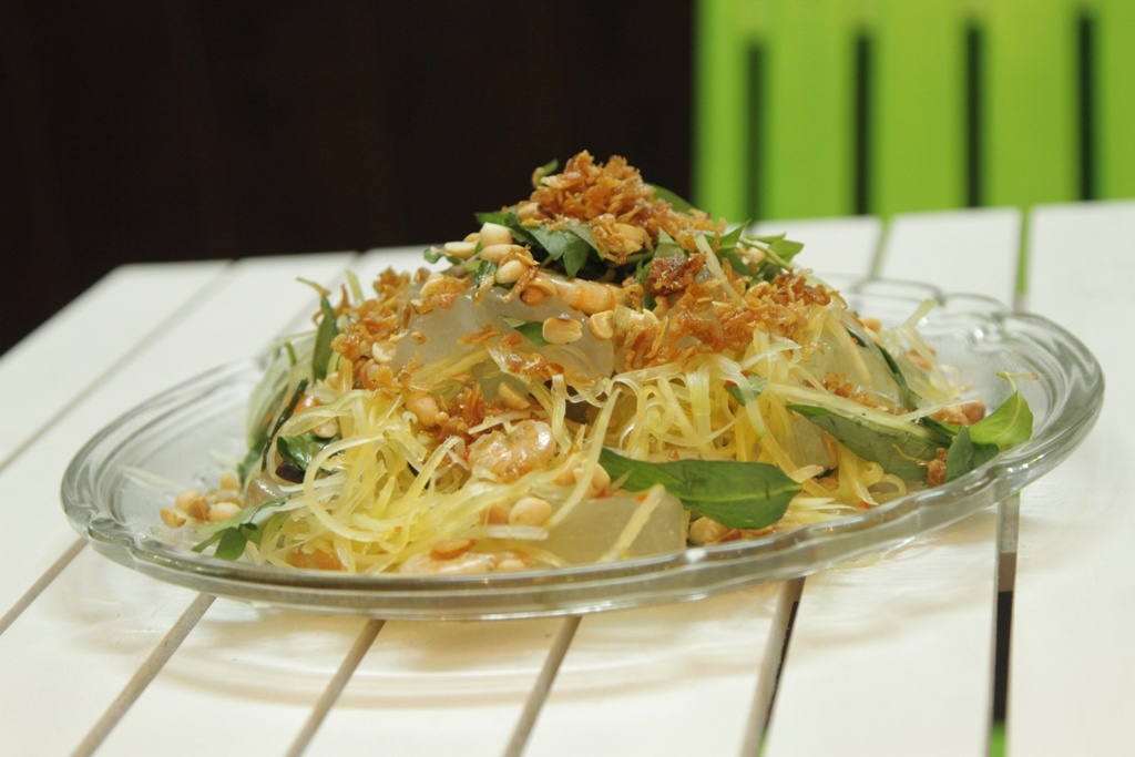 Món gỏi này dùng cuốn với bánh tráng mỏng, chấm cùng nước mắm trộn sốt lúc nãy. |