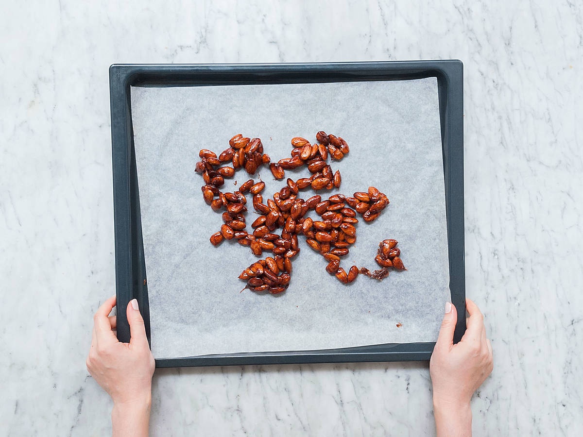 - Ngay sau khi tất cả hạnh nhân thành kẹo, chuyển lên khay nướng có lót sẵn giấy nến.
