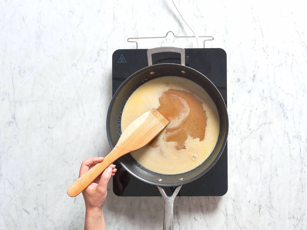 - Cho đường mía, đường cát, kem sữa béo và chiết xuất vani vào chảo chống dính, khuấy đều và nấu ở mức lửa vừa đến khi đường tan.