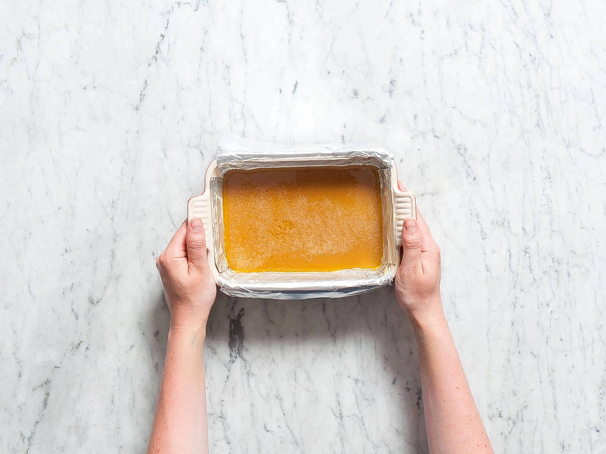 - Đổ hỗn hợp caramel vào khay và để trong tủ lạnh khoảng 60 phút hoặc đến khi kết dính thành khối.