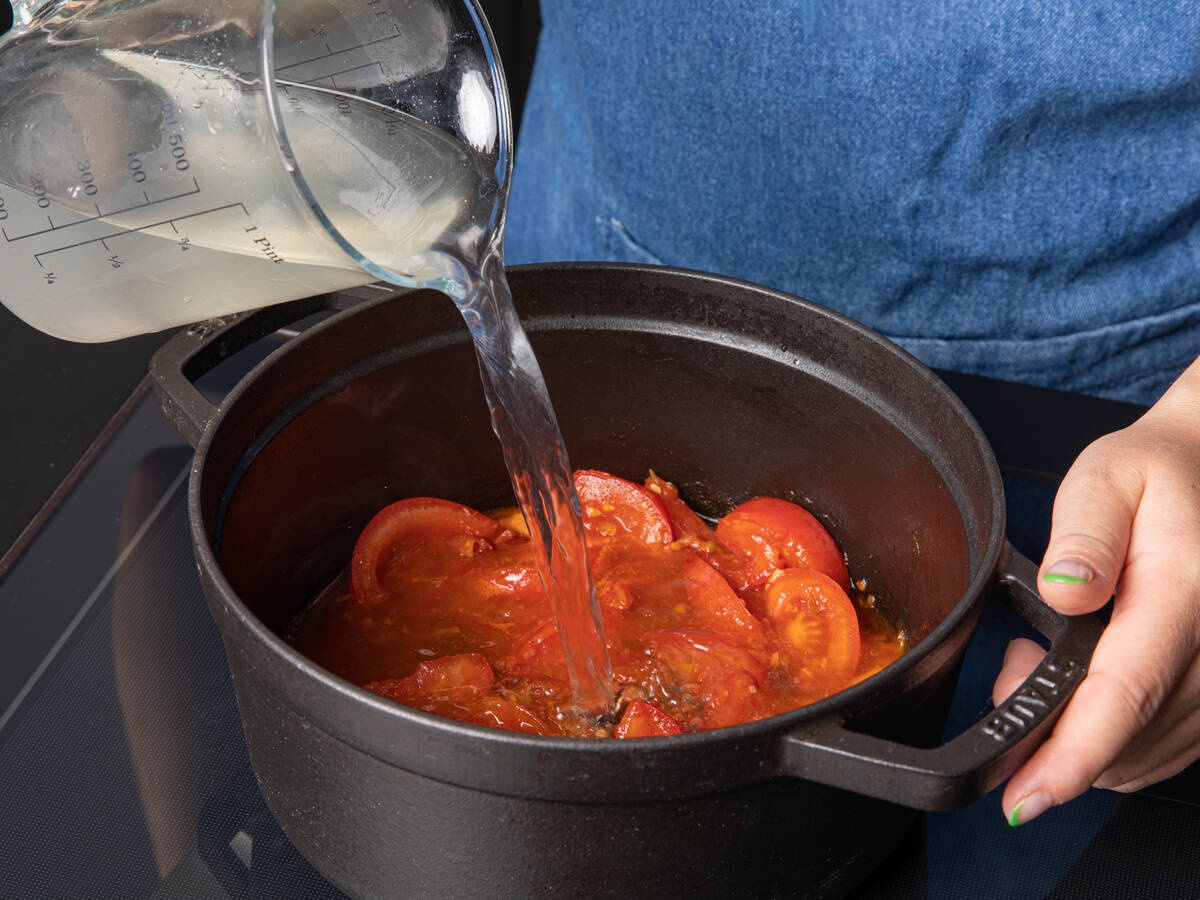 - Thêm cà chua và xào đến khi mềm, mọng nước.