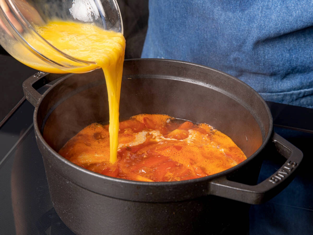 - Từ từ cho trứng đã đánh tan vào nồi canh cà chua đang đun. Để trứng tự đông lại (không cần khuấy) khoảng 30 giây.
